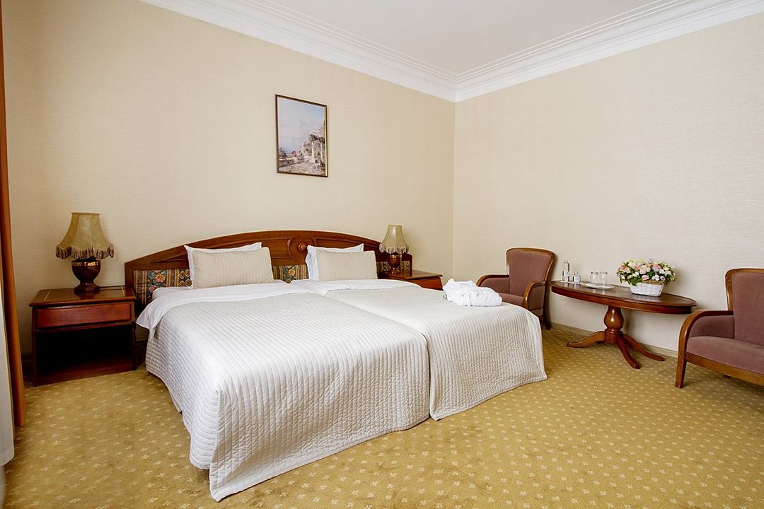 В номере: две односпальные кровати twin (100 х 200 см), гипоаллергенное постельное белье, синтепоновая подушка, прикроватная тумба, шкаф для одежды, письменный стол, стул, журнальный столик, телевизор, телефон, сейф, кондиционер, электрический чайник, Wi-Fi и возможность подключения к Интернету через выделенную линию. В ванной комнате: душевая кабина или ванна, туалет, косметические принадлежности, халат, тапочки, фен. Каждый номер имеет индивидуальную планировку. Просьба уточнять при бронировании. Указанные тарифы приведены в рублях за номер в сутки, включая налоги, согласно законодательству, действующего на момент проживания. Общее количество номеров – 12. Площадь номера: 34 – 49 м2.Услуги и удобства