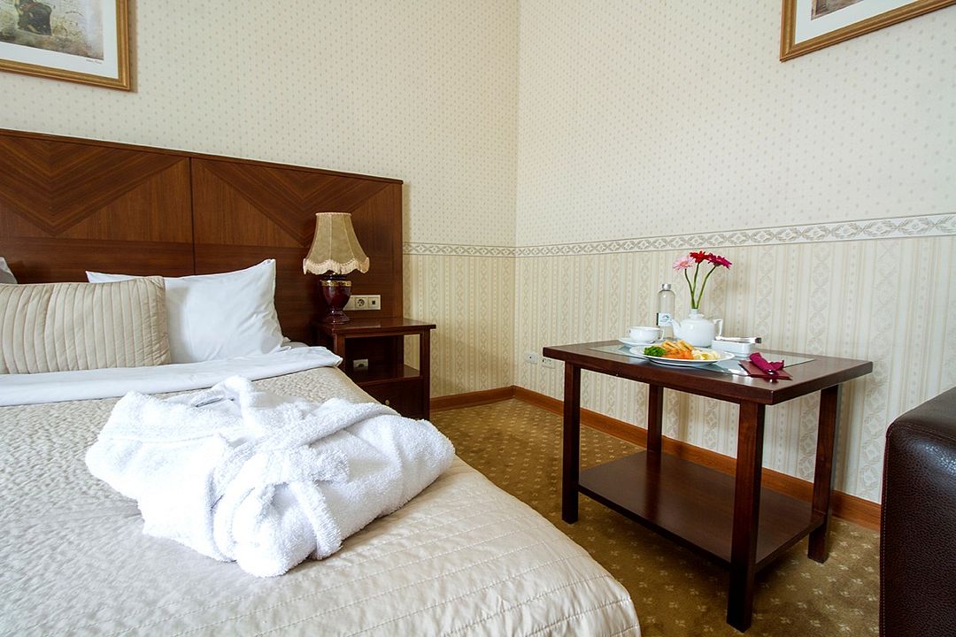 В номере: двуспальная кровать king-size (160 см х 200 см), гипоаллергенное постельное белье, синтепоновая подушка, прикроватная тумба, шкаф для одежды, письменный стол, стул, телевизор, телефон, сейф, кондиционер, электрический чайник, Wi-Fi и возможность подключения к Интернету через выделенную линию. В ванной комнате: душевая кабина или ванна, туалет, косметические принадлежности, халат (по запросу), тапочки, фен. Каждый номер имеет индивидуальную планировку. Просьба уточнять при бронировании. Указанные тарифы приведены в рублях за номер в сутки, включая налоги, согласно законодательству, действующего на момент проживания. Общее количество номеров – 23. Площадь номера: 18 – 27 м2.Услуги и удобства