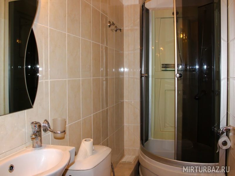 В номере: телевизор, 2 кровати, тумбочки, стол, шкаф, санузел с душевой кабиной и туалетом, туалетные принадлежности