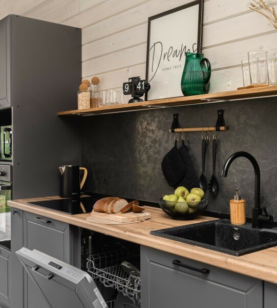 В доме три уютные комнаты, просторная кухня-гостиная и современный санузел. Дом полностью оборудован всем необходимым для комфортного проживания: от бытовой техники до настольных игр и книг. Гостям доступны теплые пледы для уютных вечеров на террасе, а также игровая приставка для развлечений в кругу семьи или друзей.