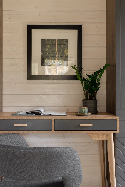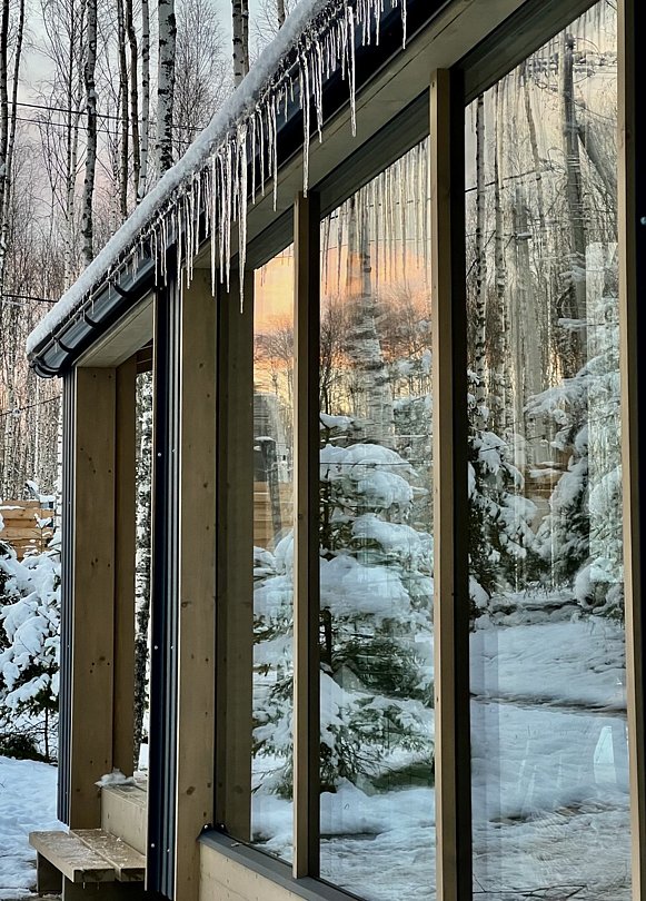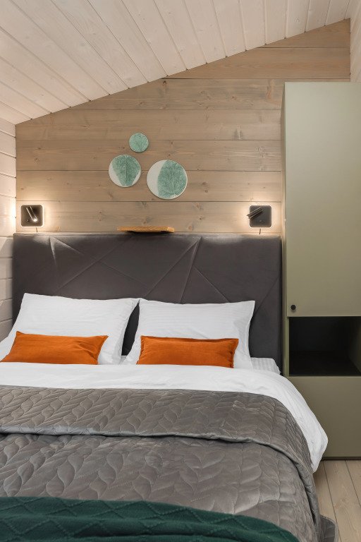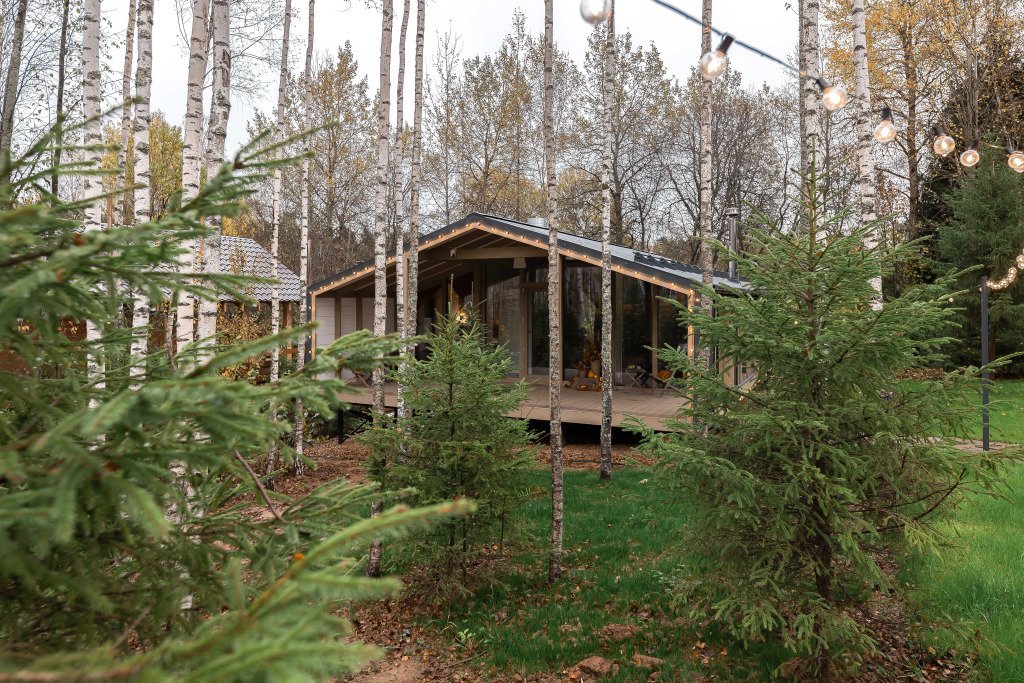 - комната с кроватью 160х200 и панорамным видом на березовый лес;
