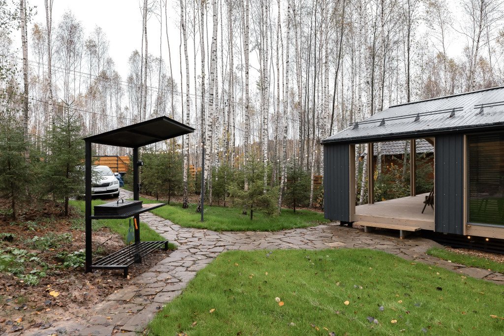 Снаружи дома: просторная веранда с видом на березовый лес и ели, терраса с мини-бассейном и панорамой с альпийской горки, большой мангал с навесом, четыре кресла ECO, костровая чаша, парковка на два автомобиля, автоматические ворота с пульта, асфальтированные подъездные пути, ночная подсветка дорожек и новогодняя подсветка дома.