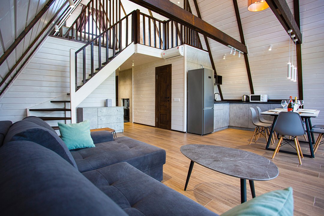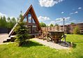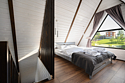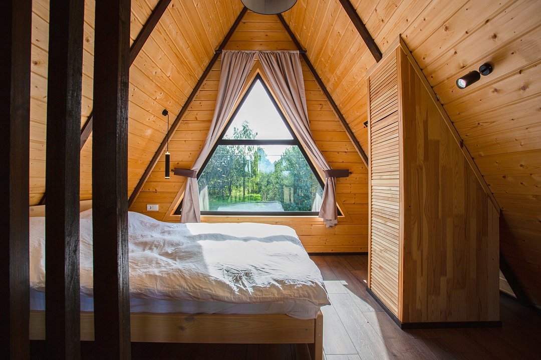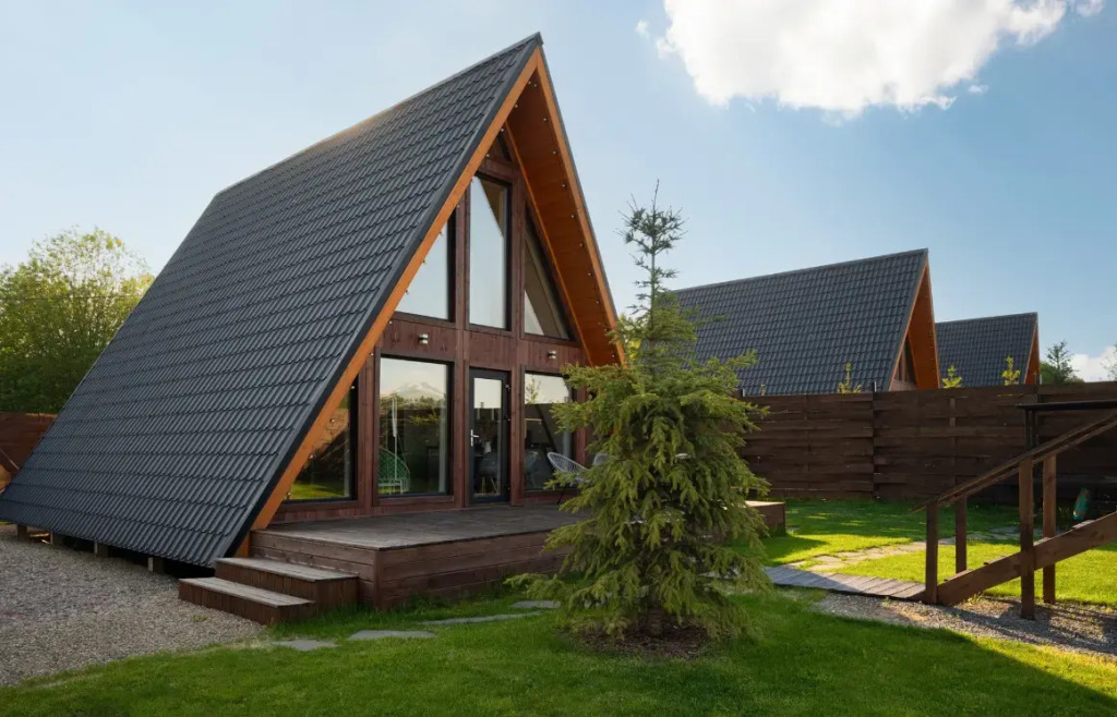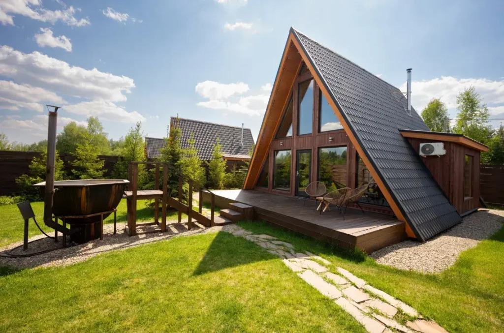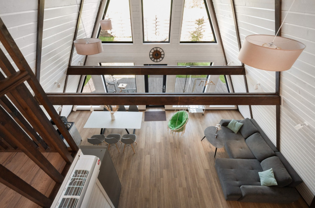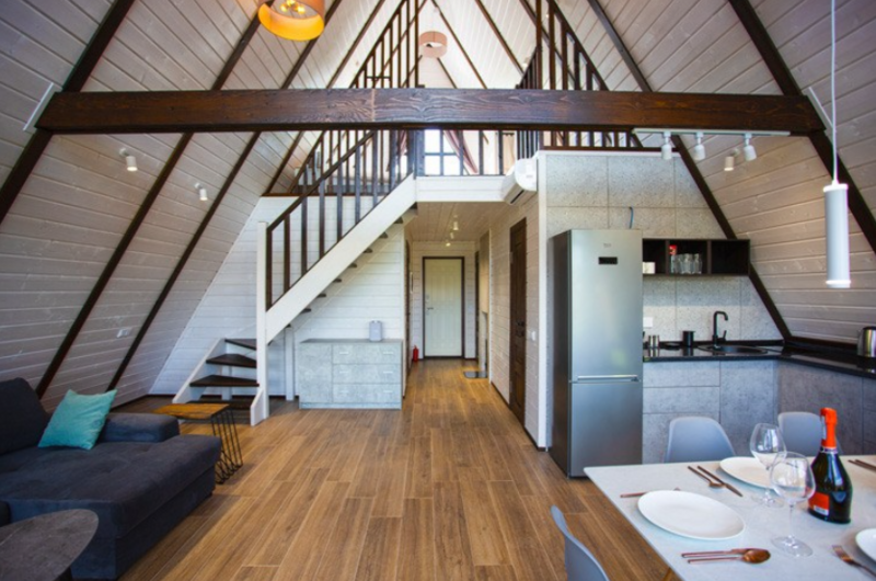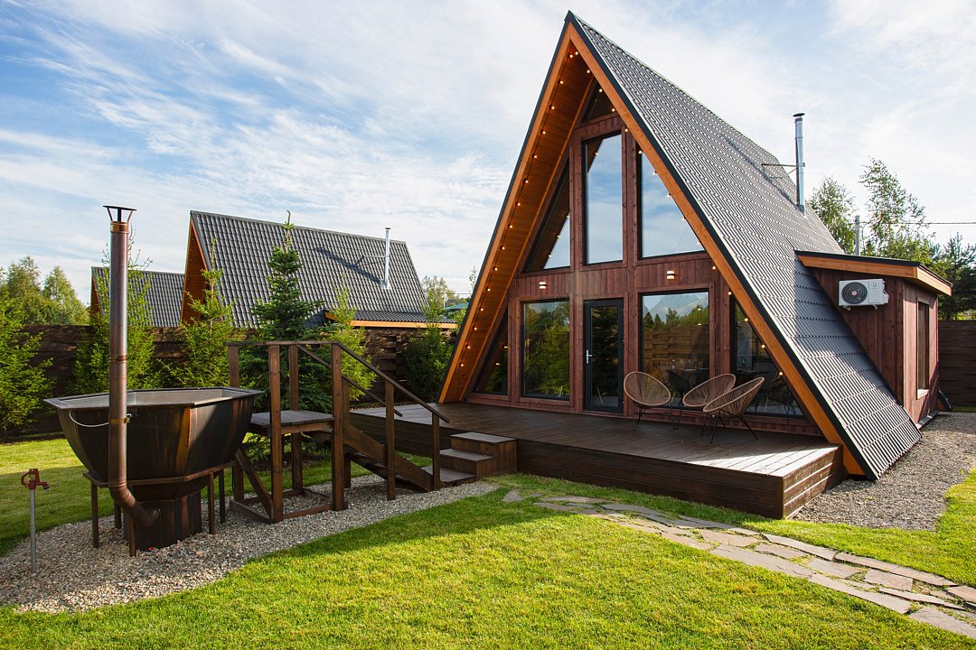 Большой А-фрейм треугольный коттедж, для отдыха семьей или компанией до шести человек. Коттедж в цвет светлого дерева. Коттедж в белом цвете.