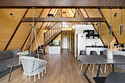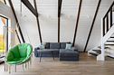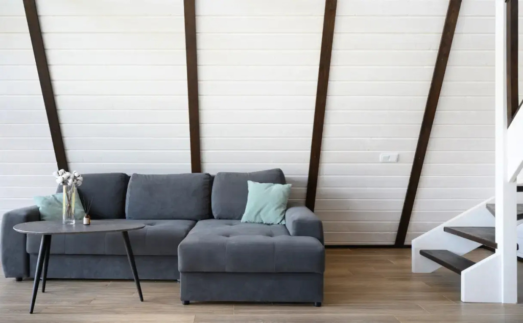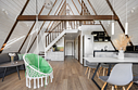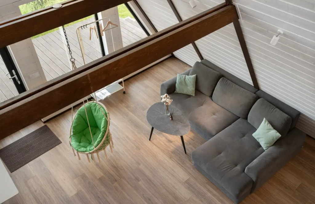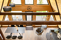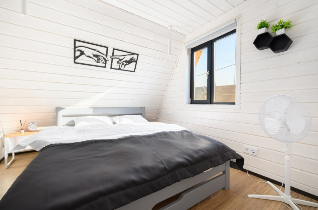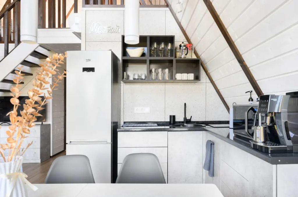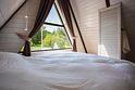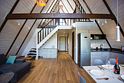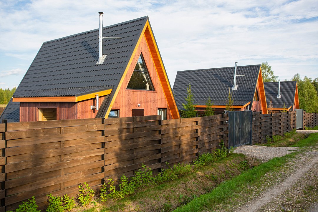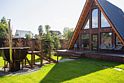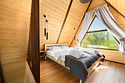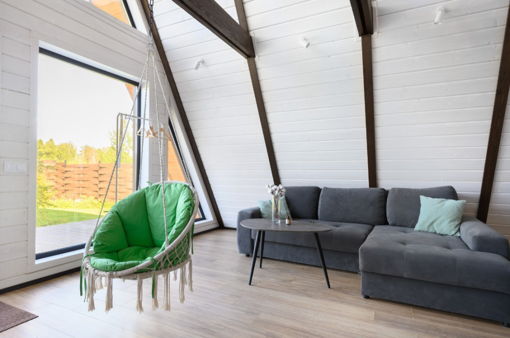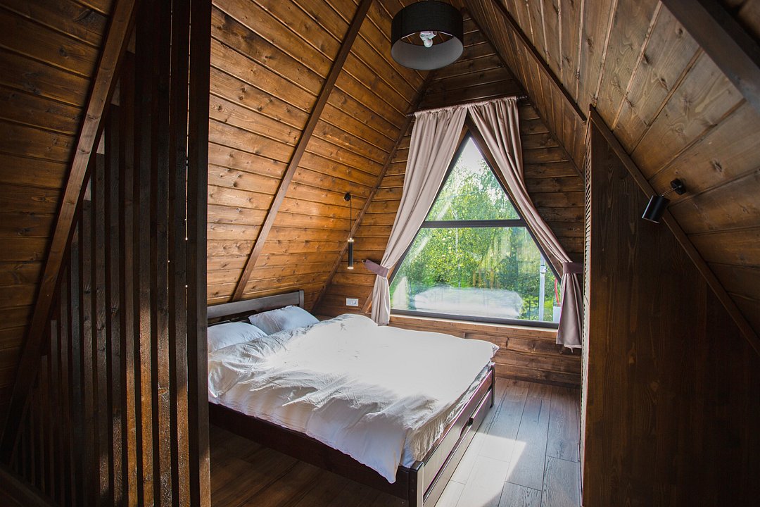 Большой А-фрейм треугольный коттедж, для отдыха семьей или компанией до шести человек. Коттедж в цвет светлого дерева. Коттедж в белом цвете.