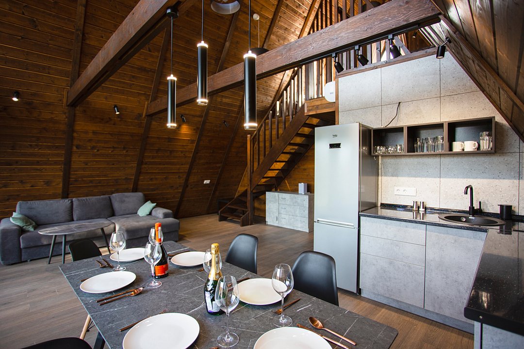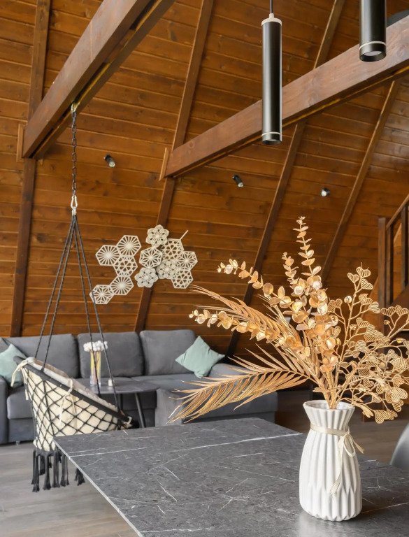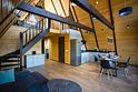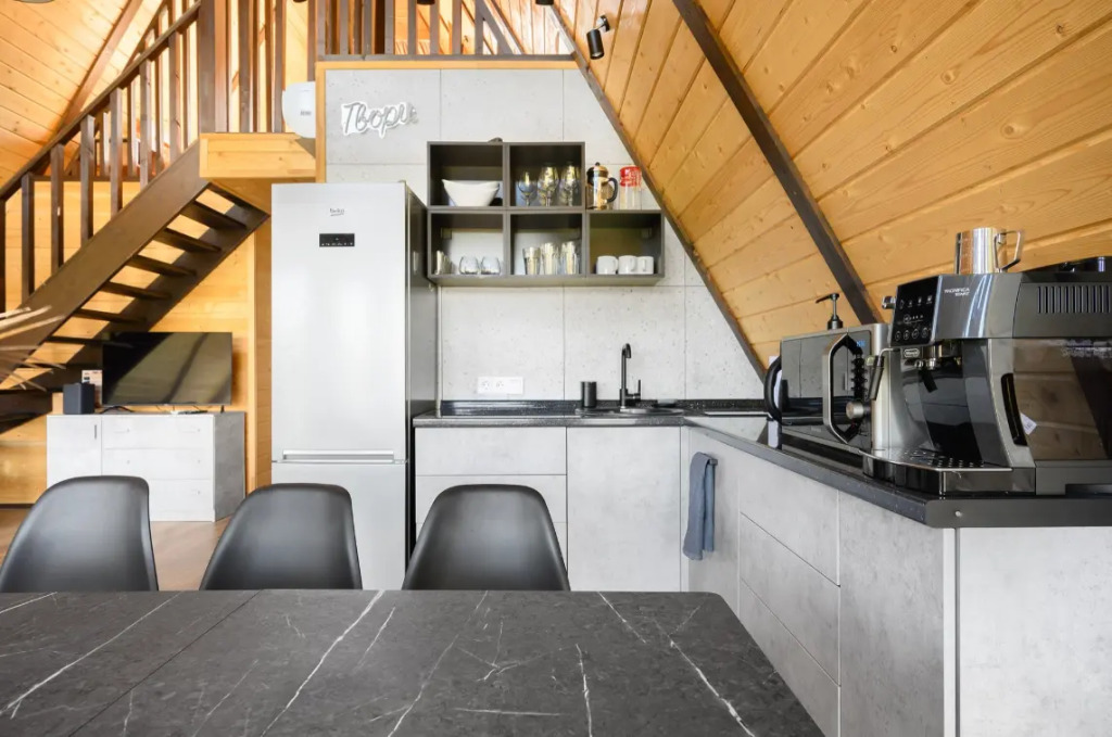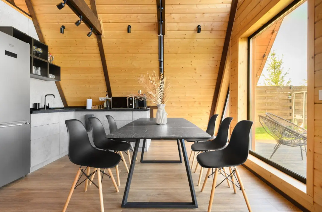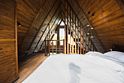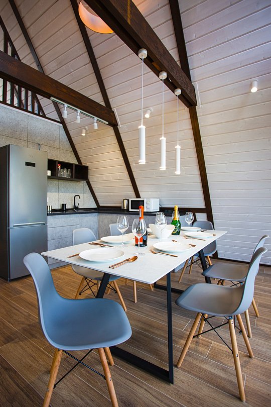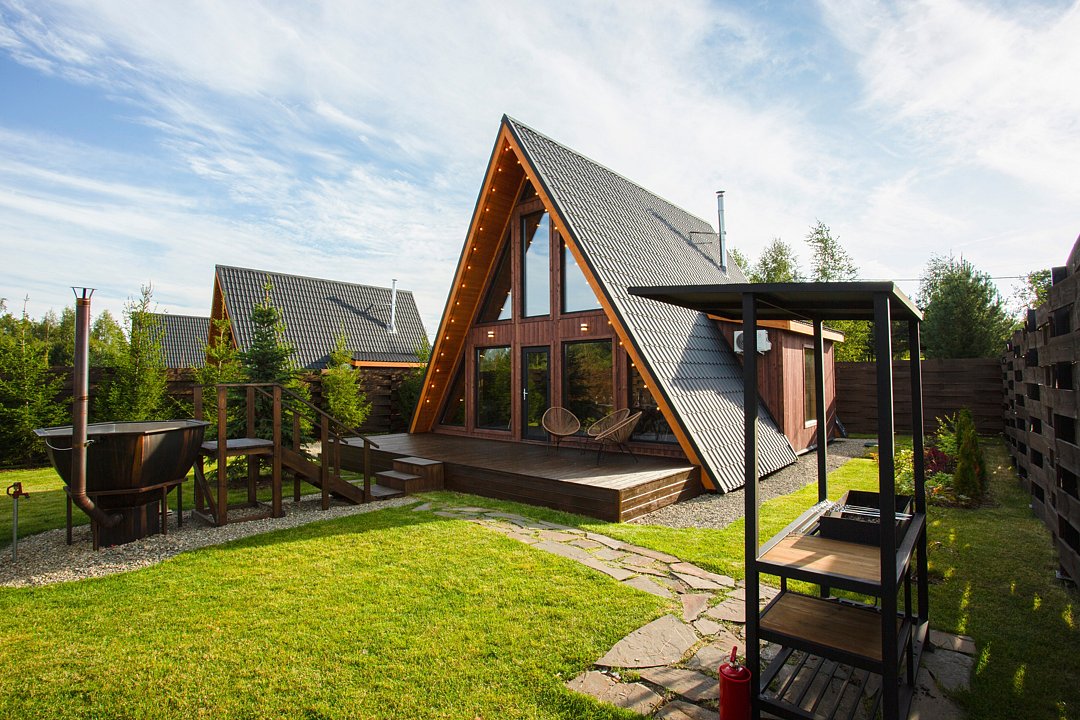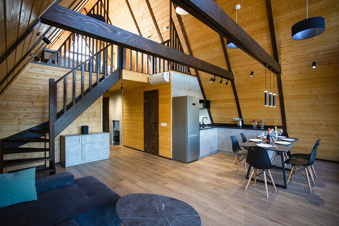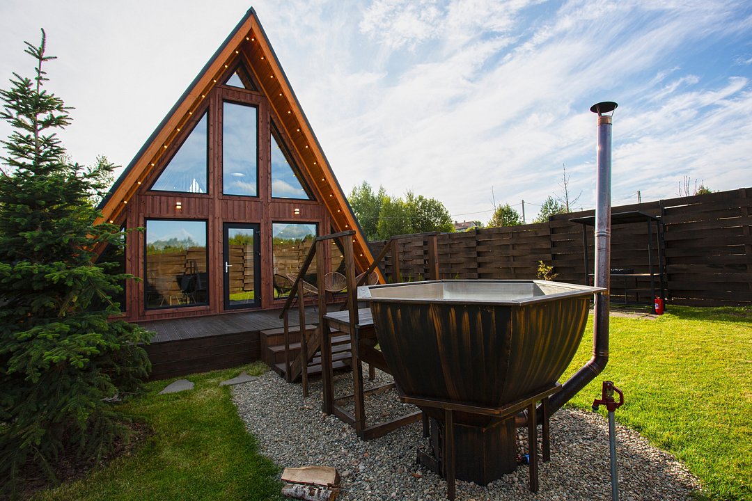 Большой А-фрейм треугольный коттедж, для отдыха семьей или компанией до шести человек. Коттедж в темных тонах.