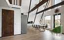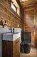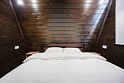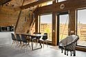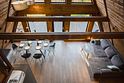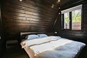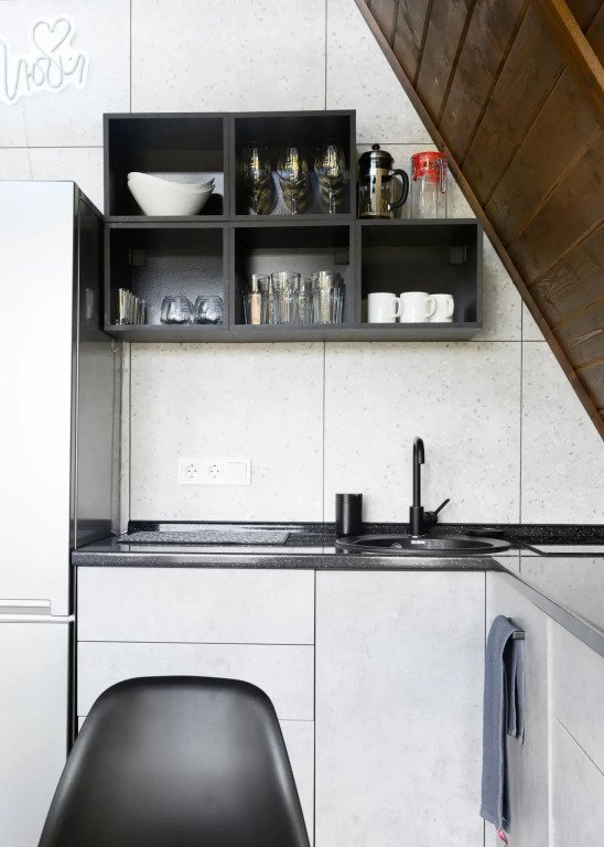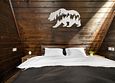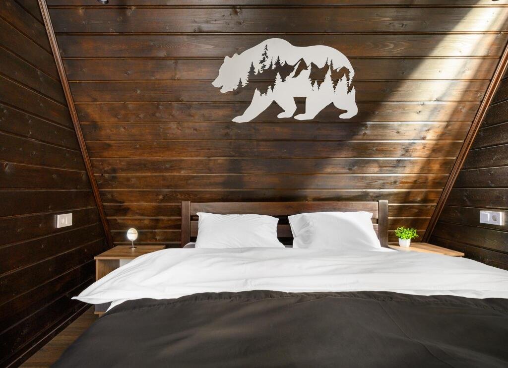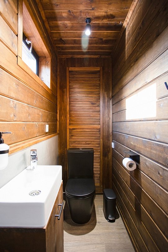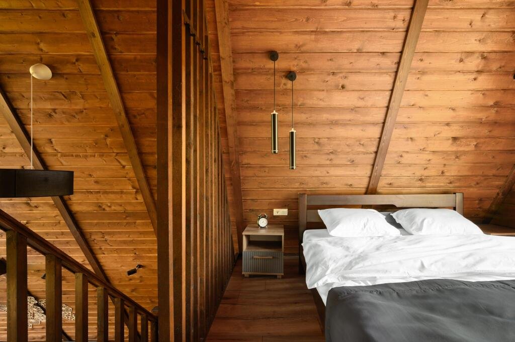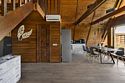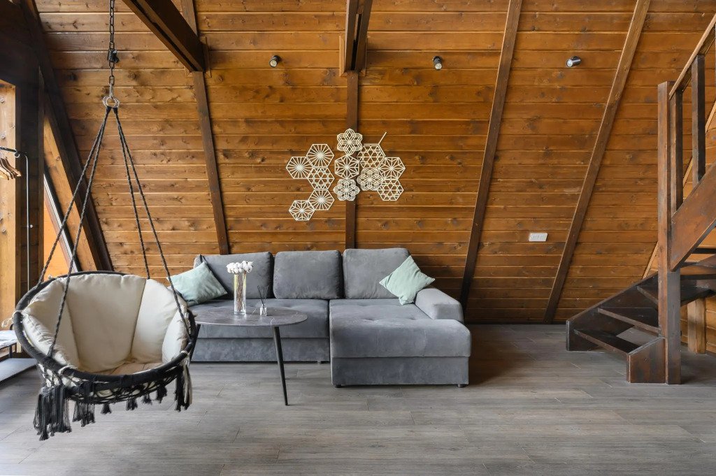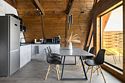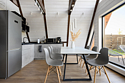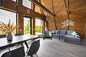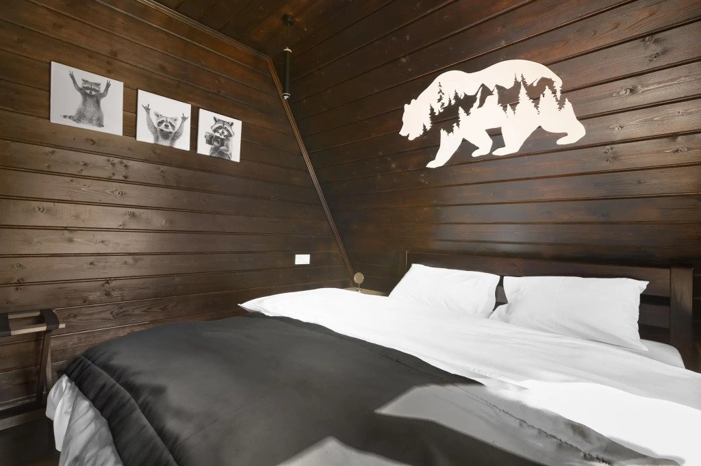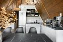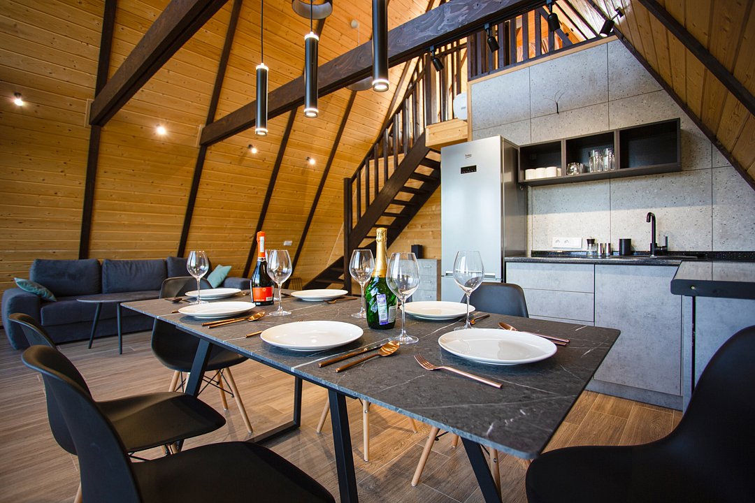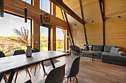 Большой А-фрейм треугольный коттедж, для отдыха семьей или компанией до шести человек. Коттедж в темных тонах.