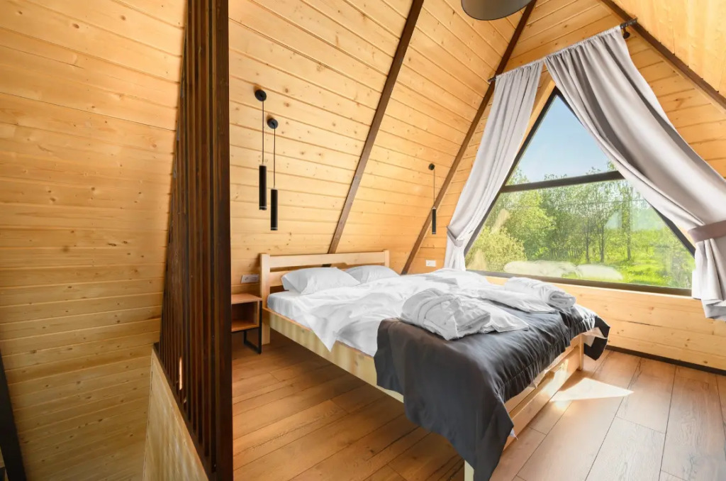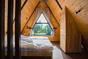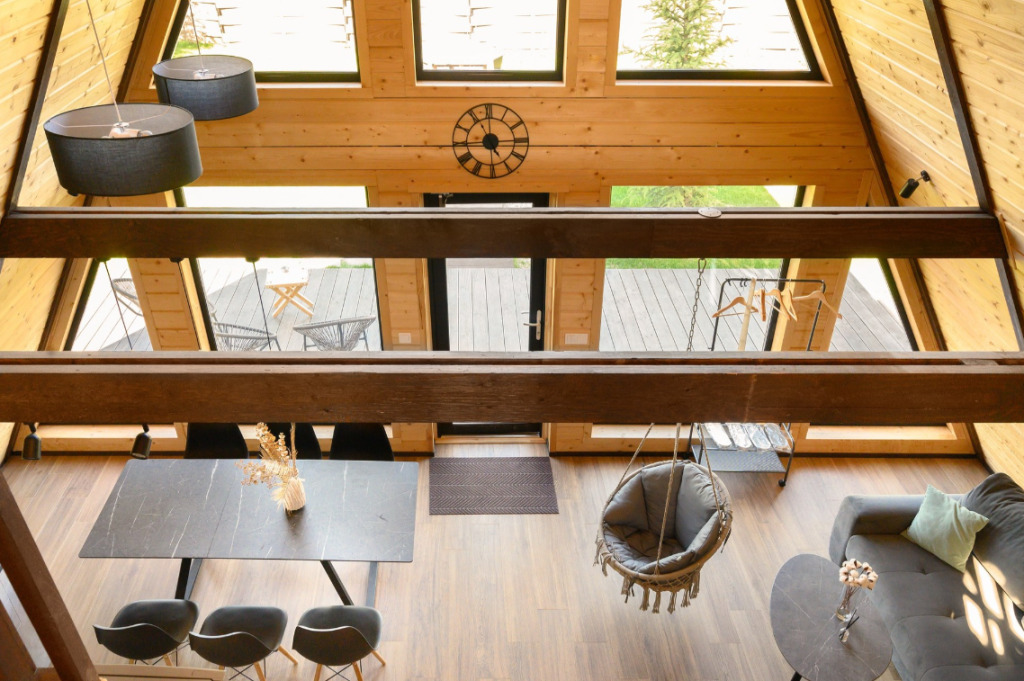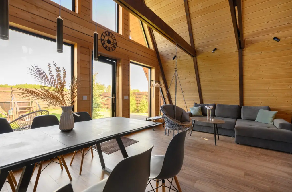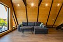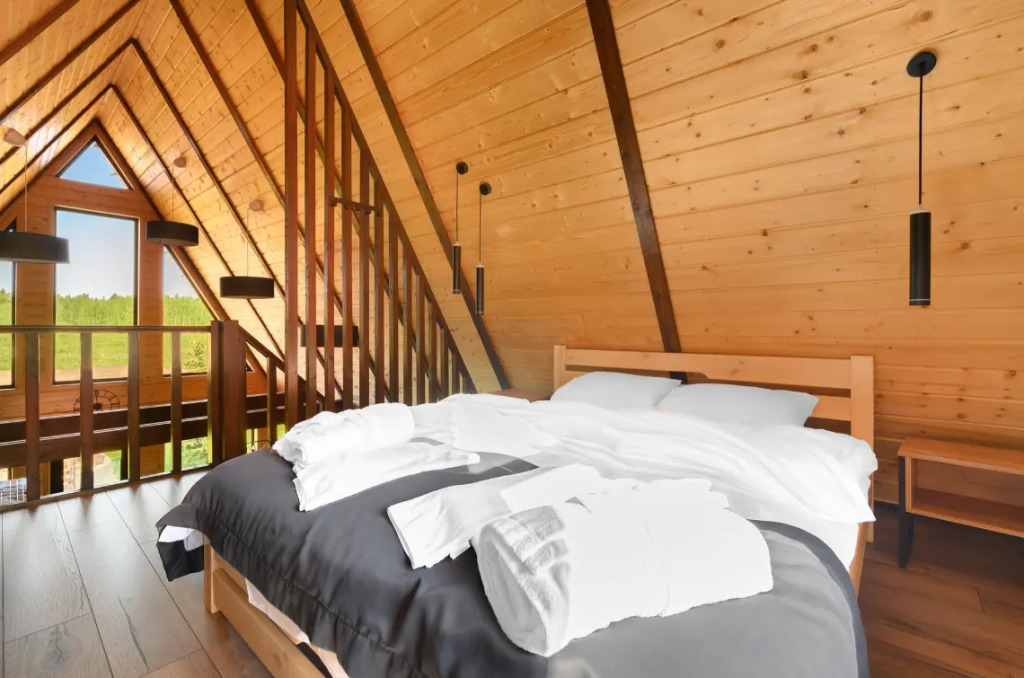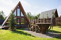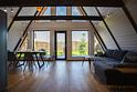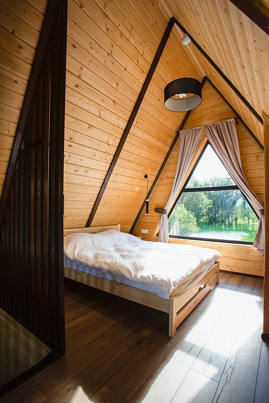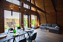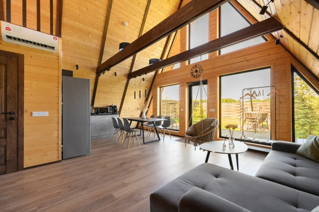 Большой А-фрейм треугольный коттедж, для отдыха семьей или компанией до шести человек. Коттедж в цвет светлого дерева.