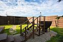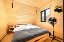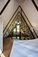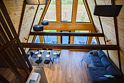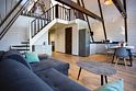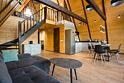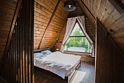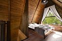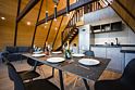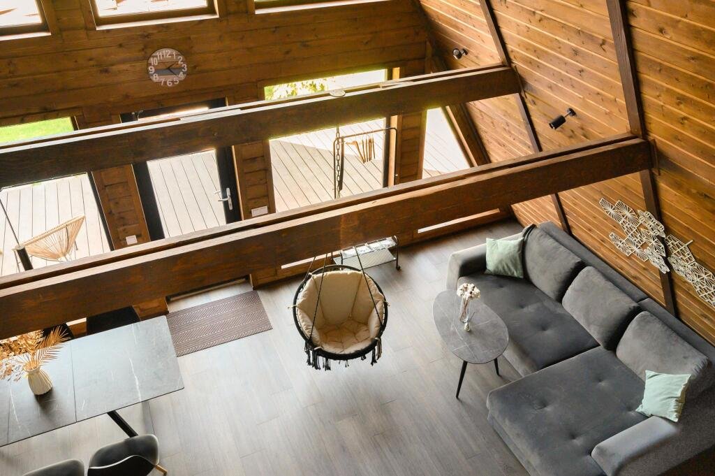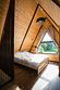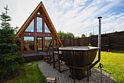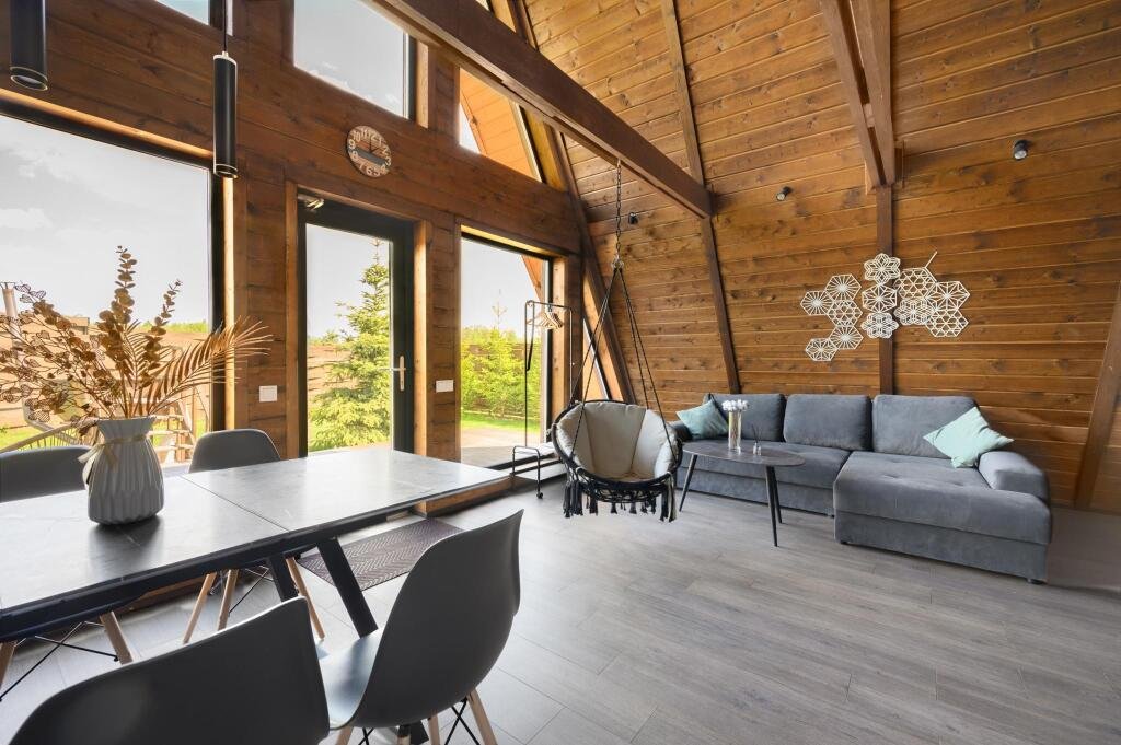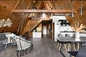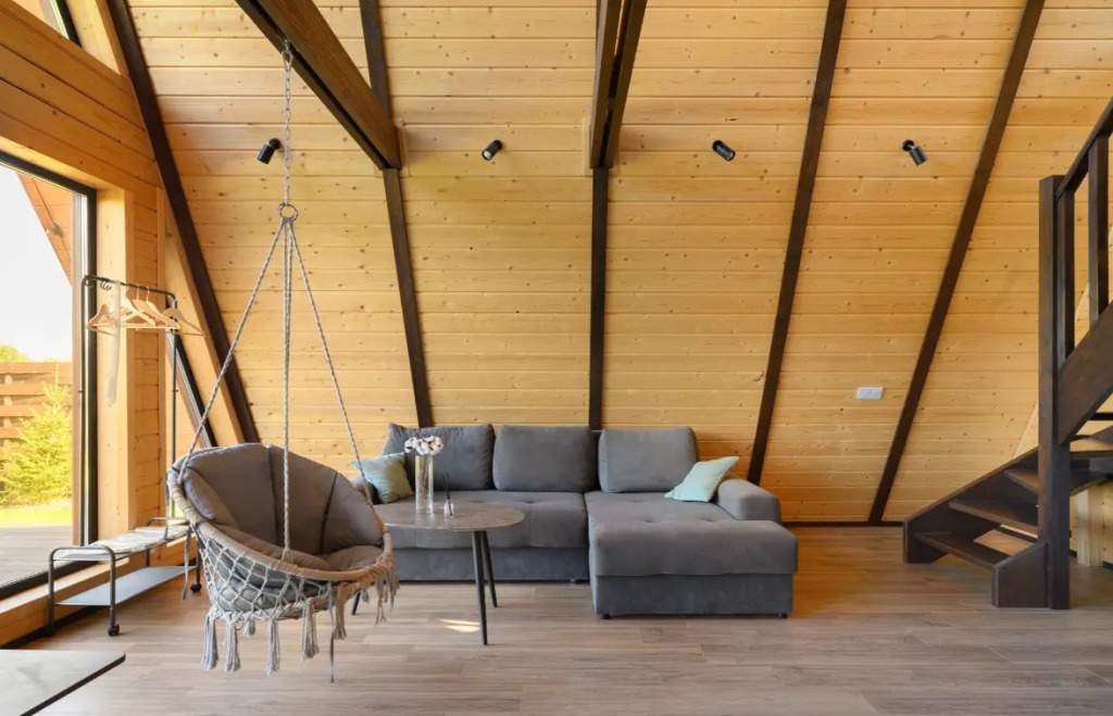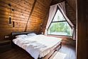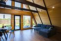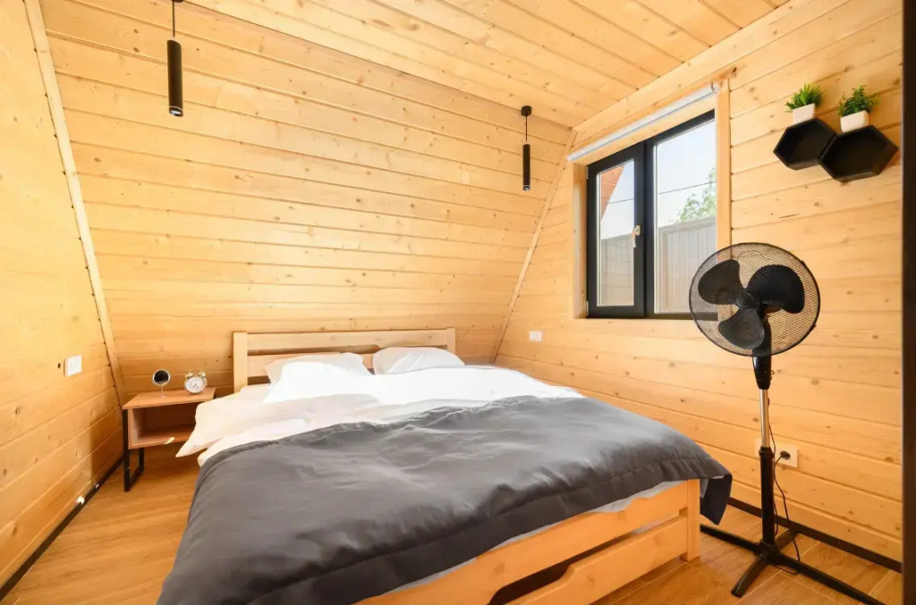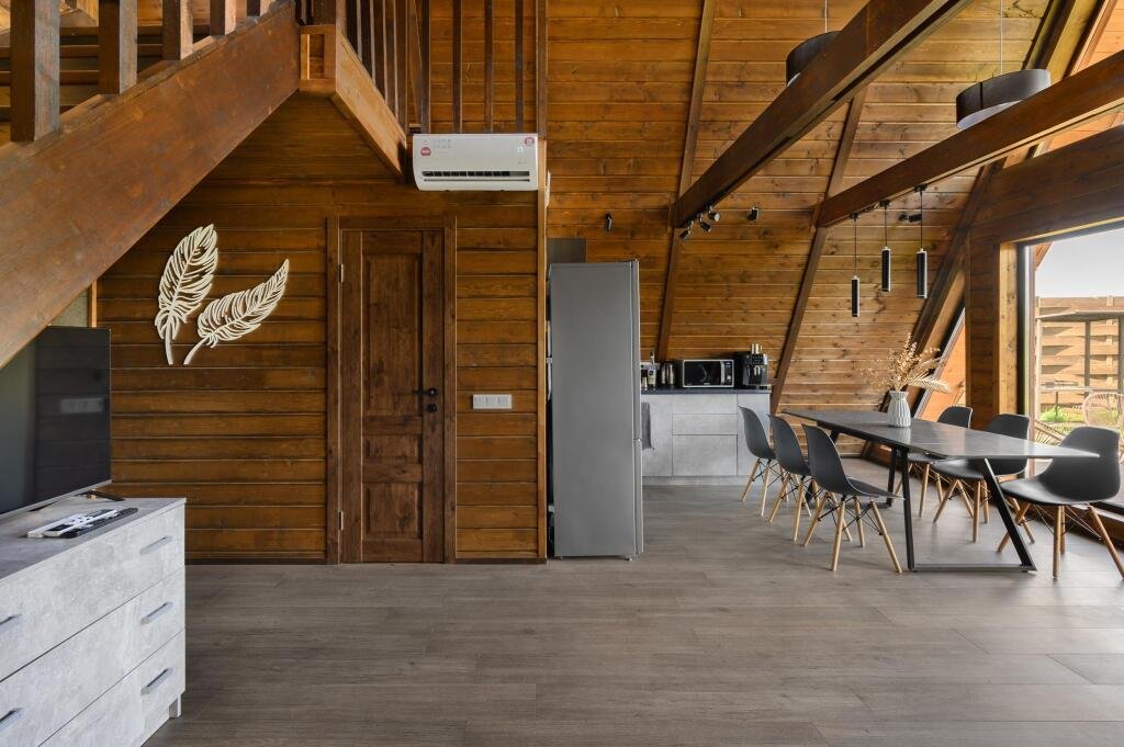 Большой А-фрейм треугольный коттедж, для отдыха семьей или компанией до шести человек. Коттедж в цвет светлого дерева.