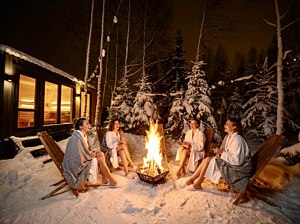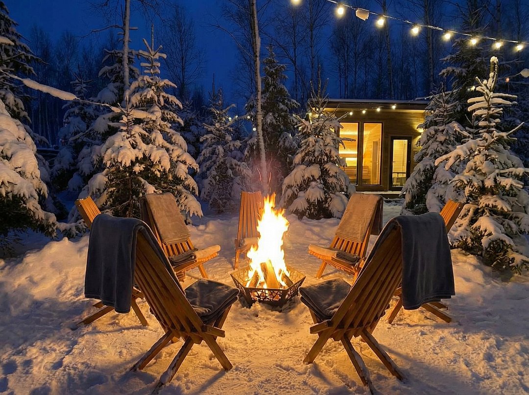 В загородном доме «ЕлкиШале» гости могут насладиться отдыхом у костра в специально оборудованной зоне на свежем воздухе. Для создания уютной атмосферы у огня необходимо заранее приобрести дрова, уголь и розжиг за отдельную плату.
