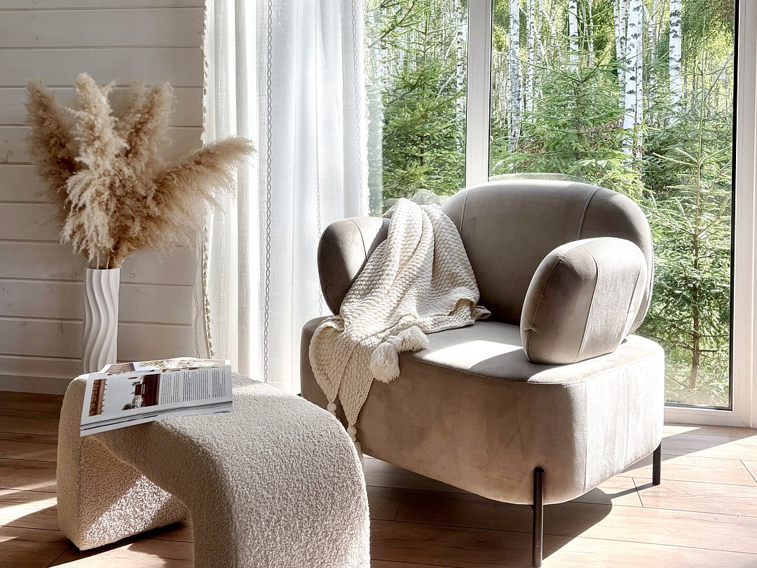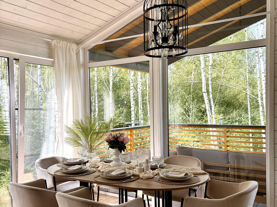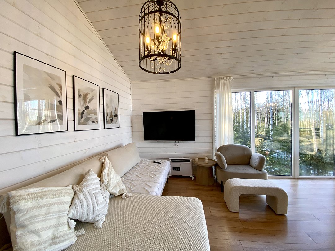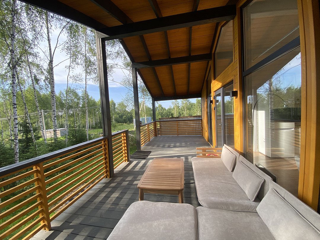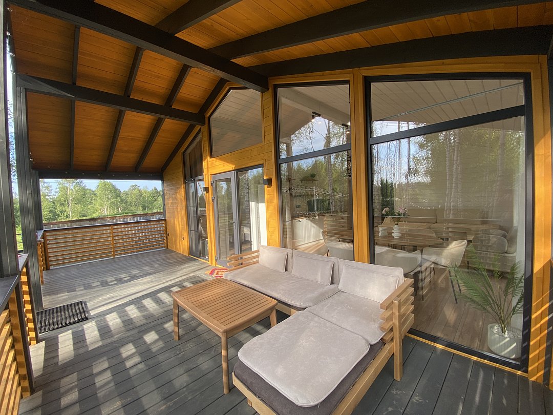 Терраса с удобным диваном, креслами и столом. Высокоскоростной Wi-Fi, Smart-TV пятьдесят пять дюймов с голосовым управлением.. Гриль-зона с мангалом и решеткой. Костровая зона с садовыми креслами на шесть мест. Москитные сетки на всех окнах — можно спать с открытыми окнами и без насекомых.
