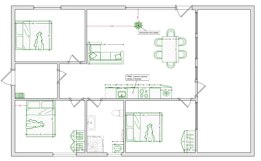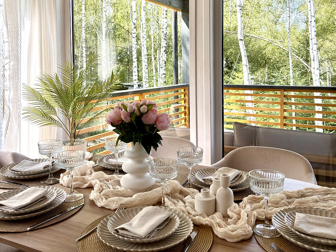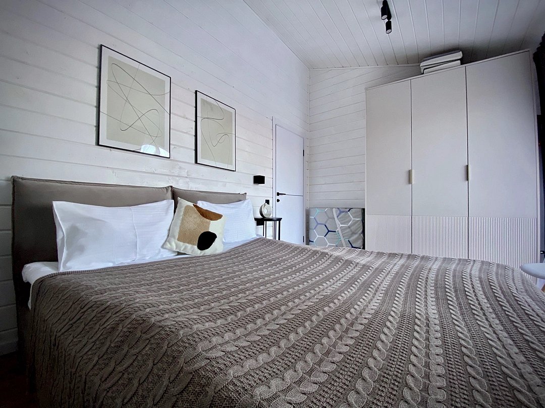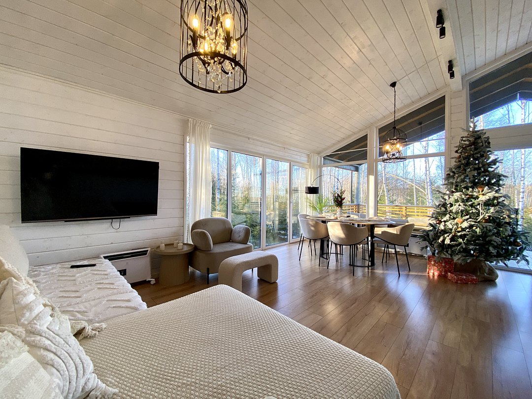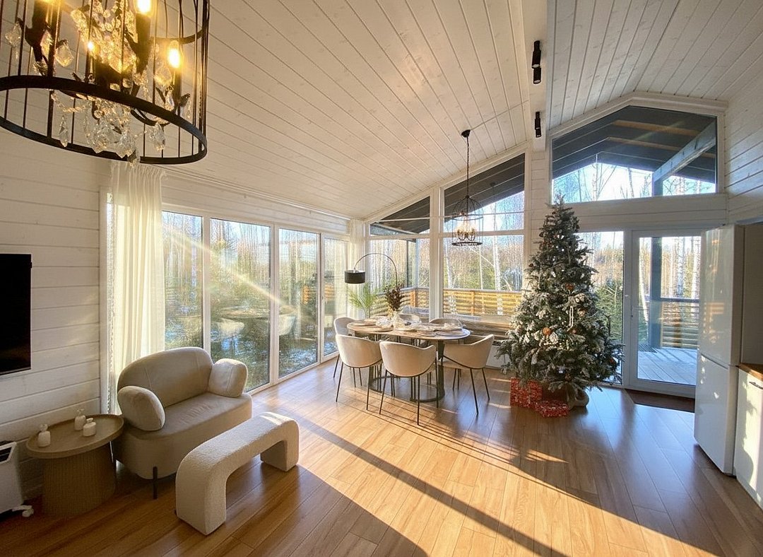 Дом «ЕлкиШале» оснащен всем необходимым для Вашего отдыха: три уютные спальни и просторная кухня-гостиная с раскладным диваном. Комфортное размещение для восьми гостей и предоставляются пять дополнительных мест на евро-раскладушках, а также одна детская кроватка для малыша — панорамное остекление гостиной сделает Ваше утро незабываемым.
