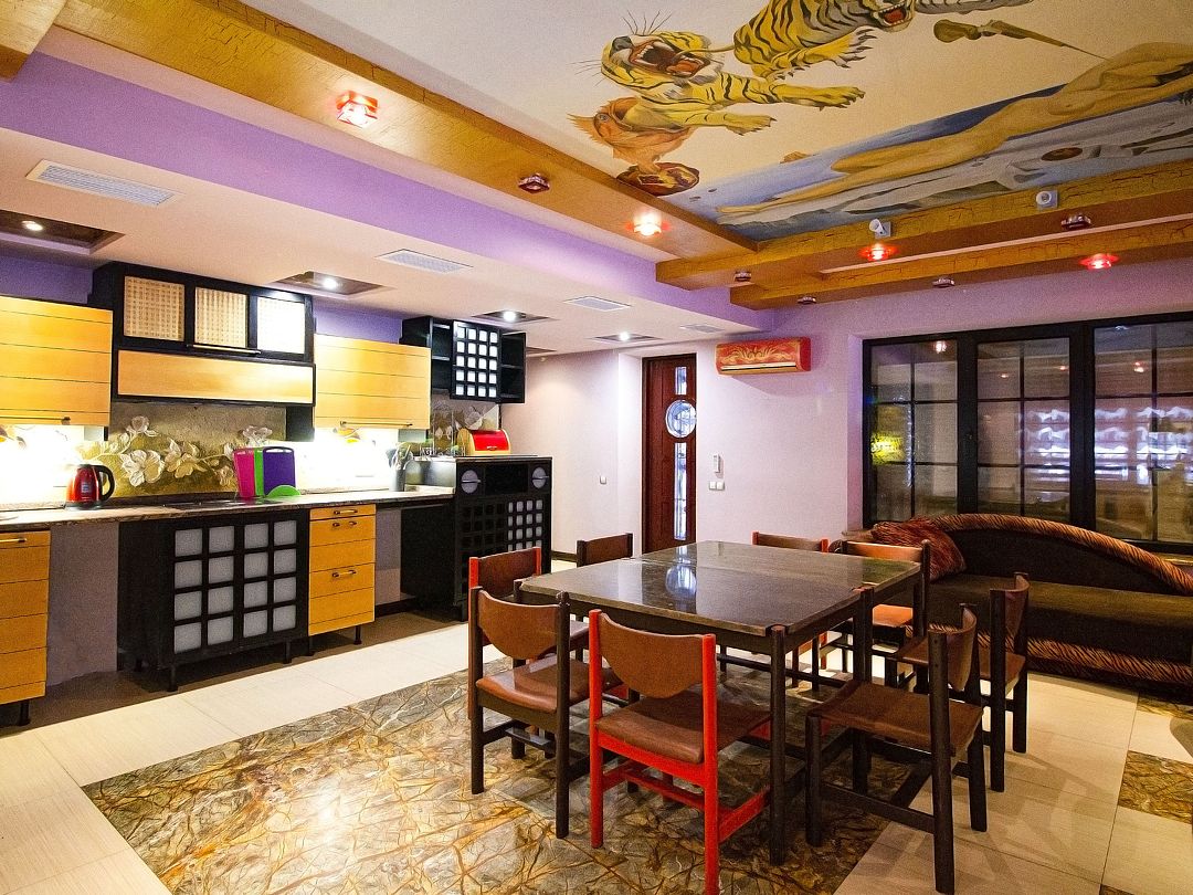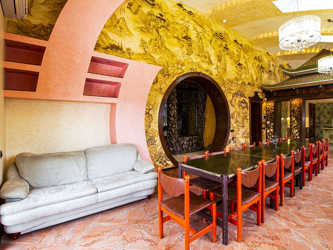 1 этаж: холл, обеденная зона, полностью оборудованная кухня 35 м², гостевой санузел, спальня с двухместной кроватью, караоке зона, бассейн, рядом лаунж-зона 100 м² (кальянная), террариум.