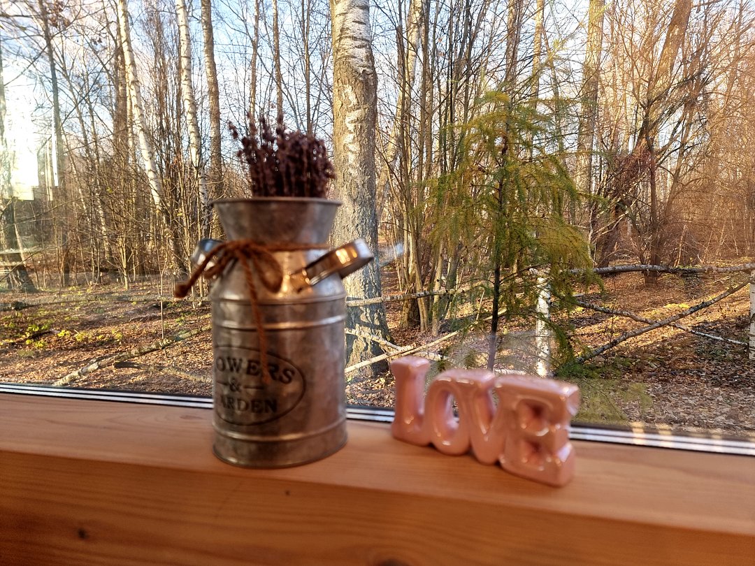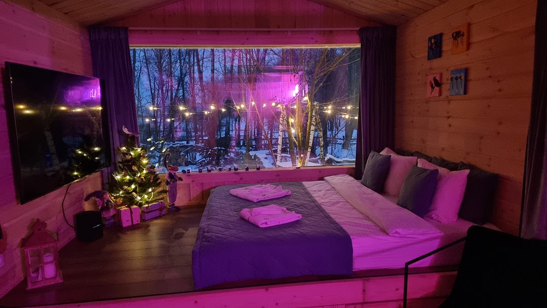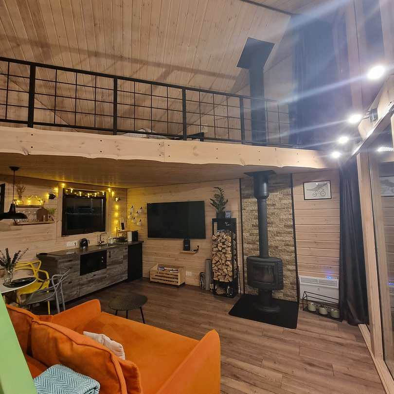 Домик с просторной гостиной с панорамными окнами и отдельной уютной спальней с видом на природу! С камином и удобным диваном!