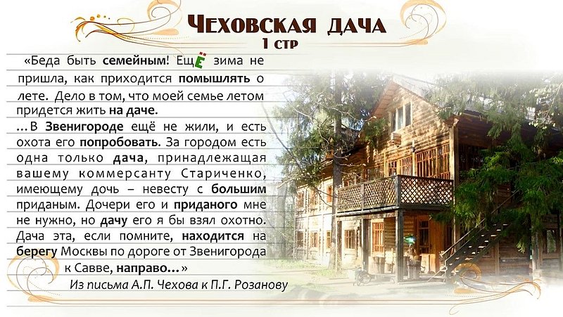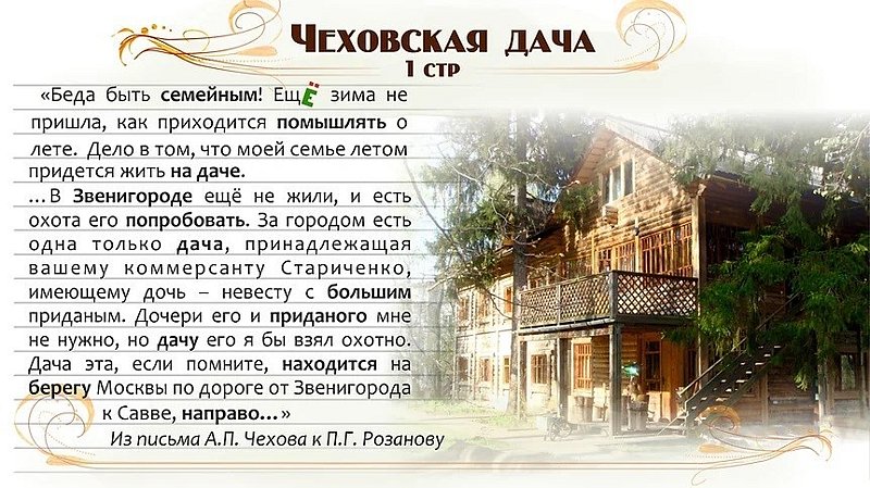 Возможно, Вам захочется погрузиться в воспоминания Вашего далекого детства или детства Ваших родителей – а, значит, формат дачи в стиле времен Антона Павловича Чехова будет Вам наиболее близок…