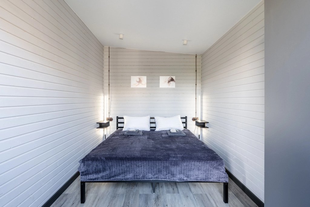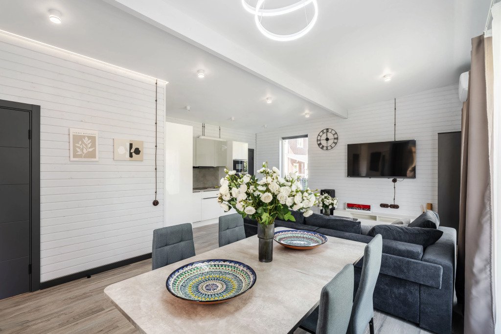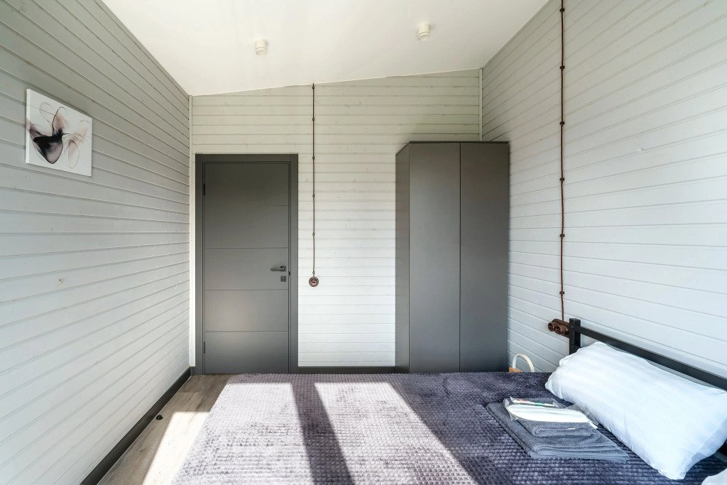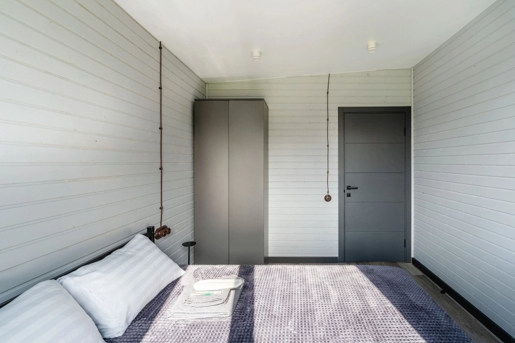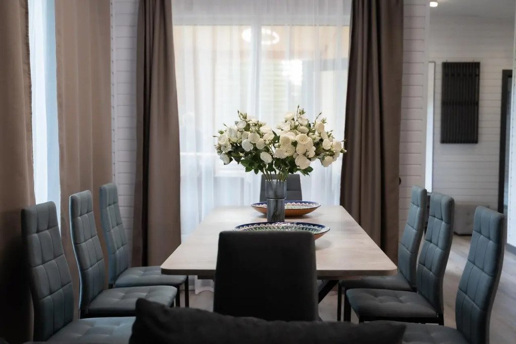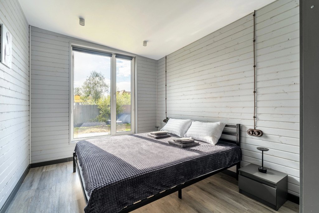 В доме: три спальни с кроватями 200х200 и двухместный диван в гостиной, шкафы с полками и вешалками, гостиная с кухней и обеденной зоной. Кондиционер.