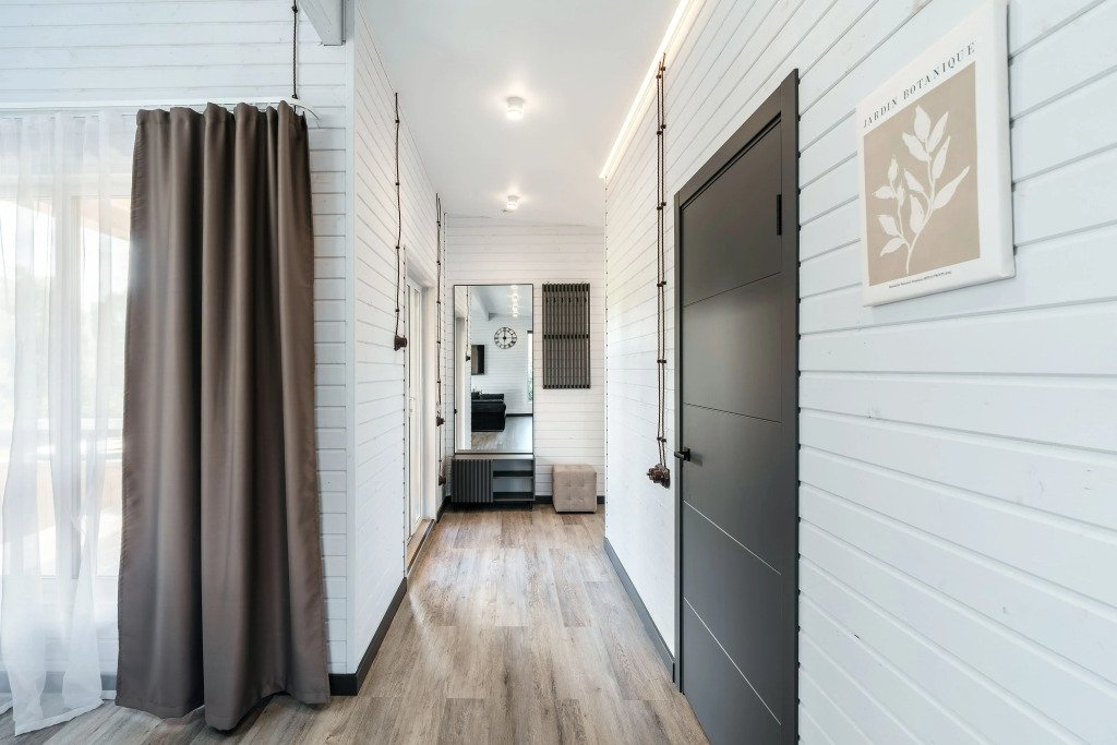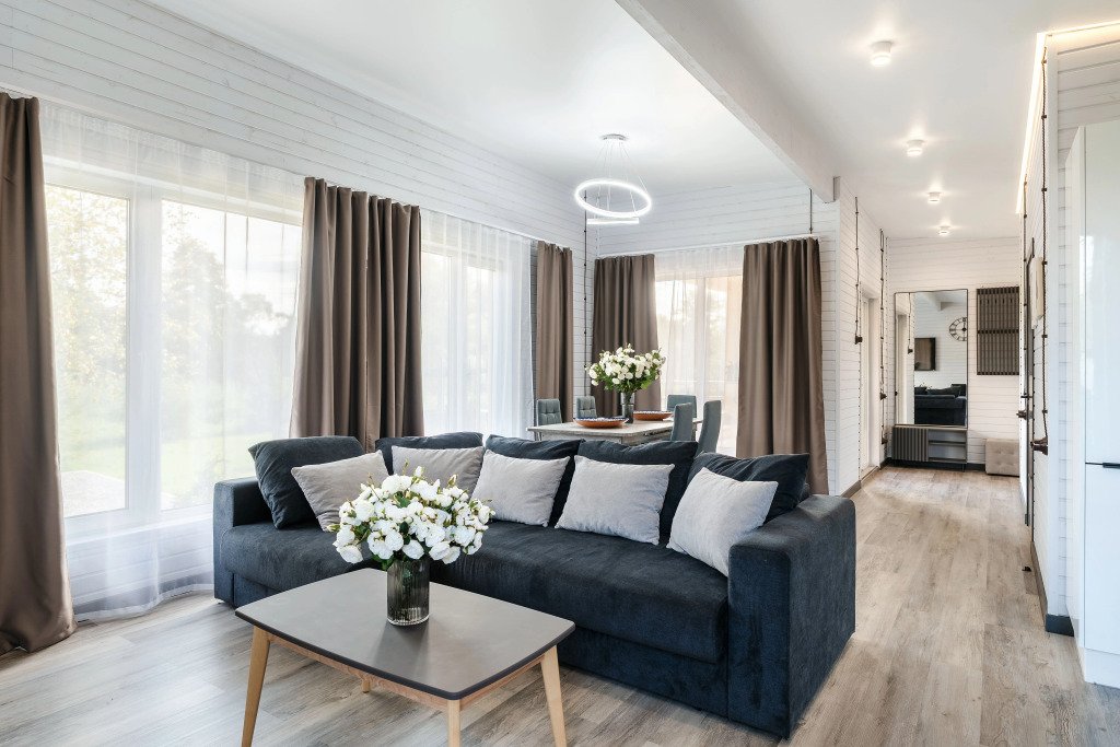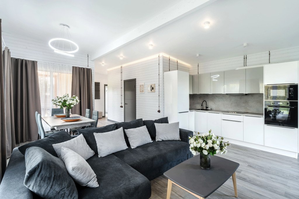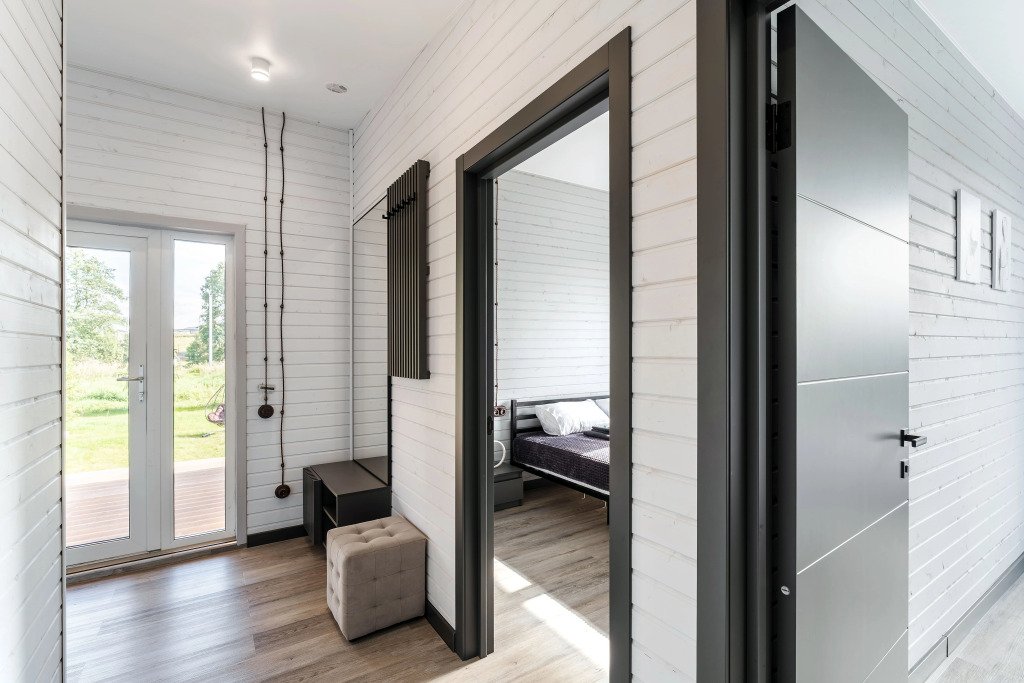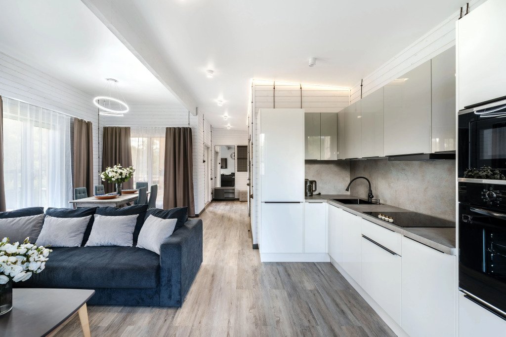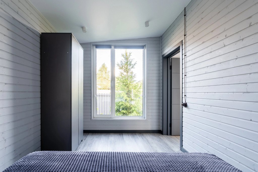 В доме: три спальни с кроватями 200х200 и двухместный диван в гостиной, шкафы с полками и вешалками, гостиная с кухней и обеденной зоной. Кондиционер.