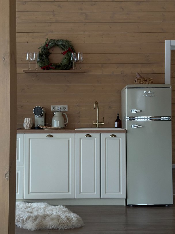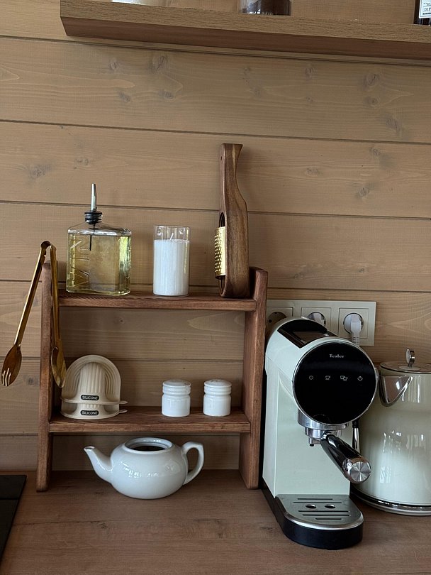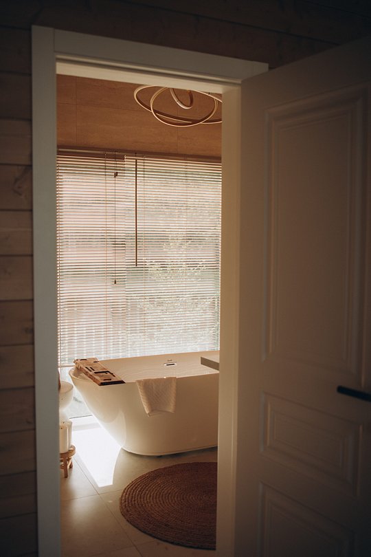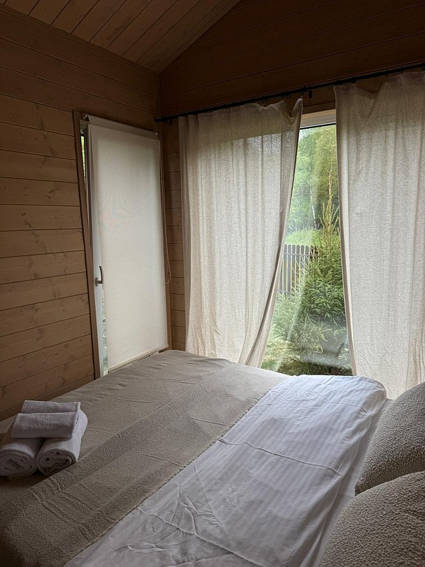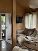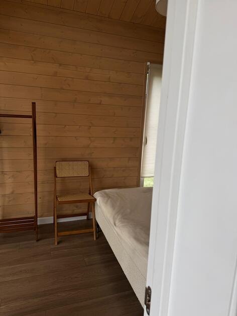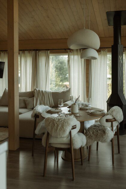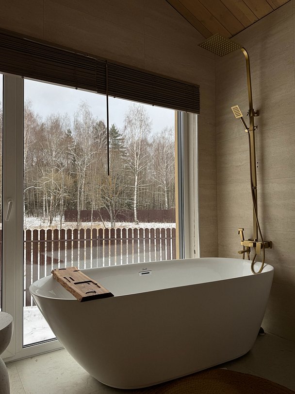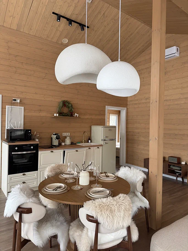 Внутренняя обстановка сочетает в себе современность и домашний уют. Две просторные спальни обеспечивают комфортные условия каждому гостю. Просторная кухня-гостиная оснащена всеми необходимыми приборами и посудой, позволяя приготовить блюда на любой вкус. Особое внимание привлекает панорамная ванна с видом на лес и стильный электрический камин, создающие атмосферу тепла и расслабления. Для отдыха предусмотрены проектор и акустическая система Marshall, обеспечивающие незабываемые впечатления от просмотра фильмов или прослушивания музыки.