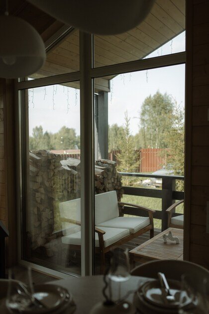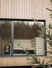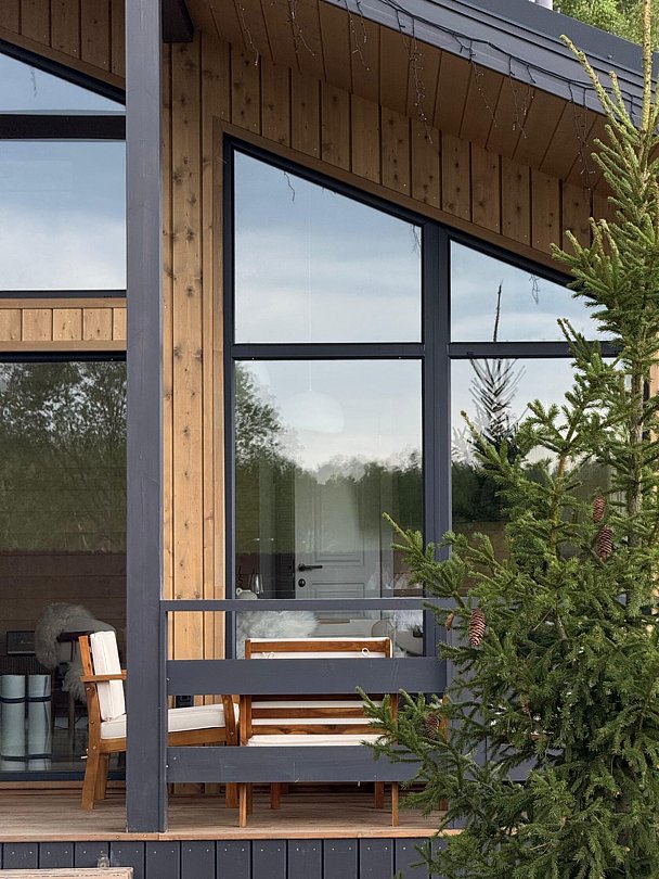 Дом в поселке Green Forest Premium окружен хвойным лесом. Просторные панорамные окна выходят на живописный пейзаж. Внутри дома есть все для комфортного проживания: две спальни, кухня-гостиная с камином и диваном, панорамная ванна с тропическим душем и видом на лес, электросауна.