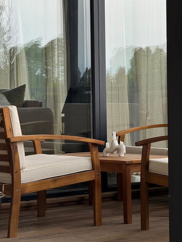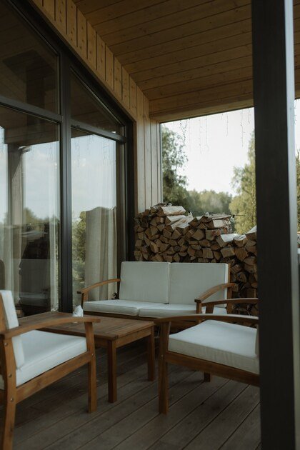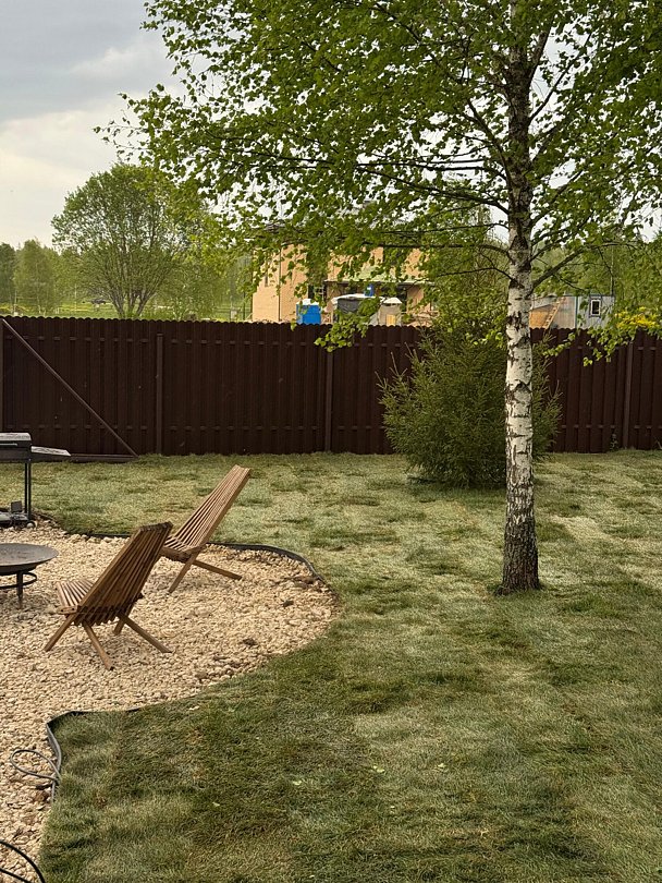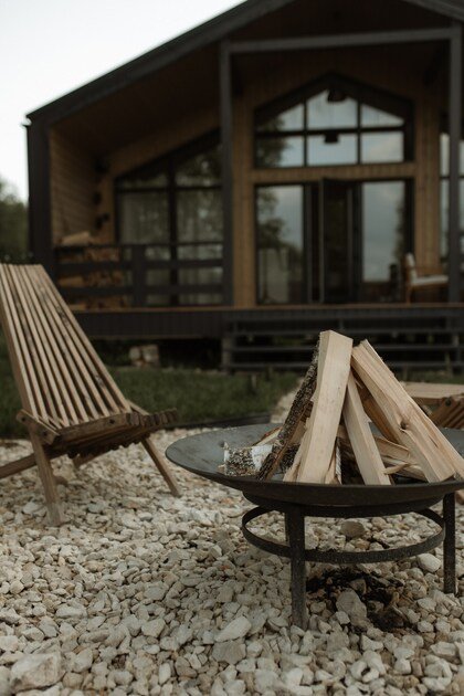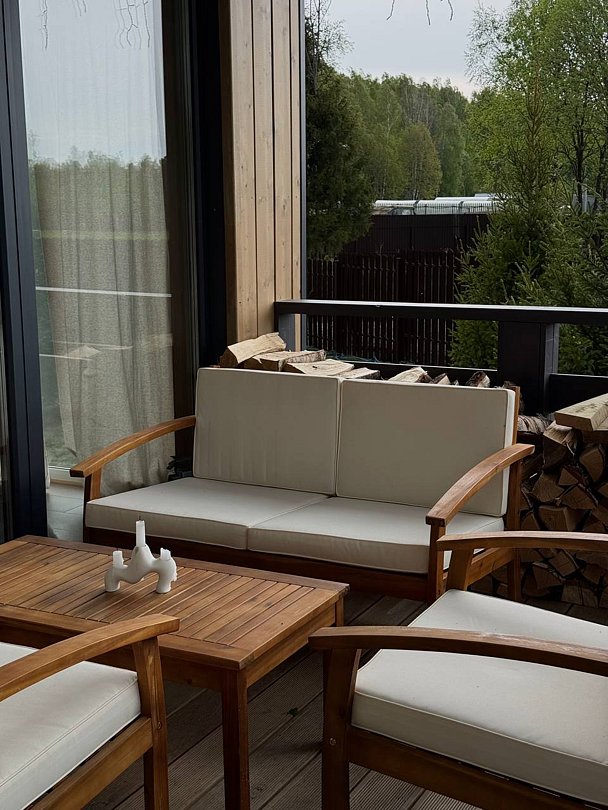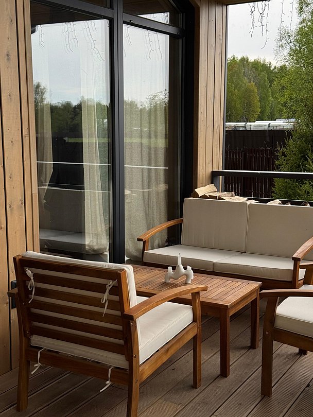 На территории дома расположена просторная терраса, где можно отдыхать на свежем воздухе. Также есть зона для готовки на открытом огне и костровище с удобными креслами. Участок полностью в распоряжении жильцов.