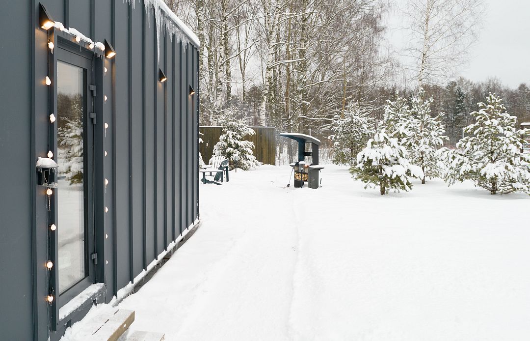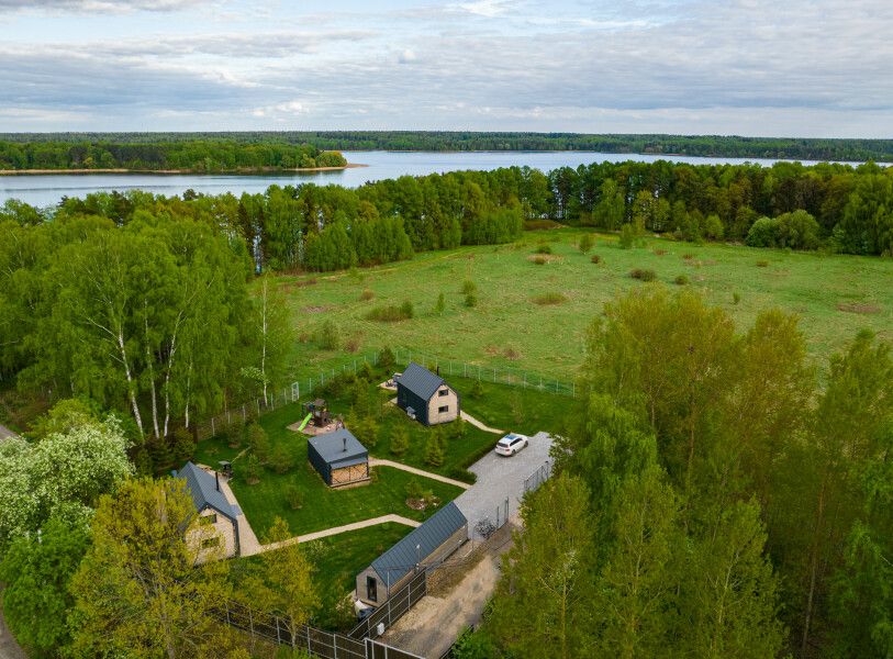 На территории расположены два дома в стиле барнхаус, которые находятся на безопасном расстоянии друг от друга. Их разделяют живописные сосны, ели, детская площадка и баня. Каждый из домиков выполнен в едином стиле, с одинаковой внутренней обстановкой и приватной территорией с мангальной зоной и костровой чашей.