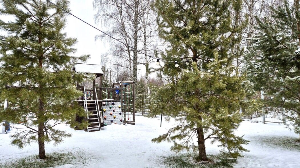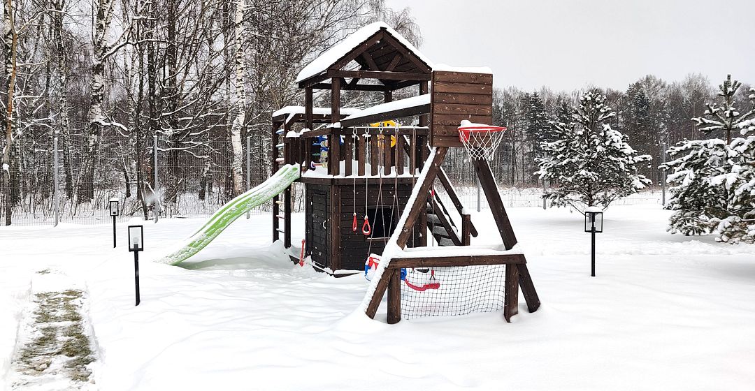 На территории есть деревянный игровой комплекс с качелями и песочницей. Расположен ближе к домику у поля.