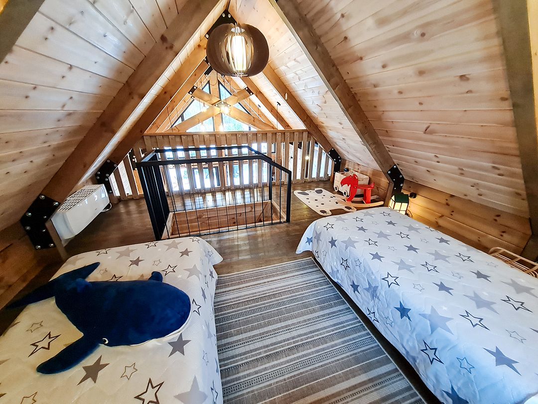 На втором этаже спальня с 2 односпальными кроватями, которые при необходимости можно сдвинуть вместе.