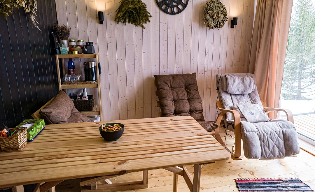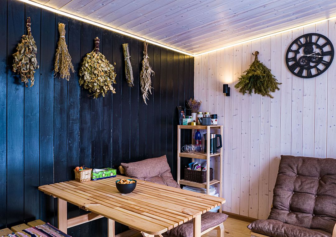 Инфраструктура: зона отдыха, обливное ведро, душ, дубовые веники, березовые веникиРусская баня на дровах, расположена между домиками.