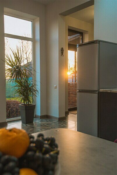 Вы можете сделать заказ из меню и еду принесут прямо в дом. Либо вы можете заказать еду к вашему заезду. Сотрудники гостевого комплекса приготовят ее и оставят в холодильнике. Вам останется лишь разогреть ее.