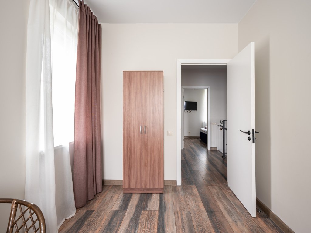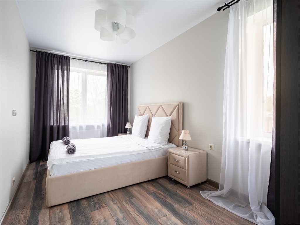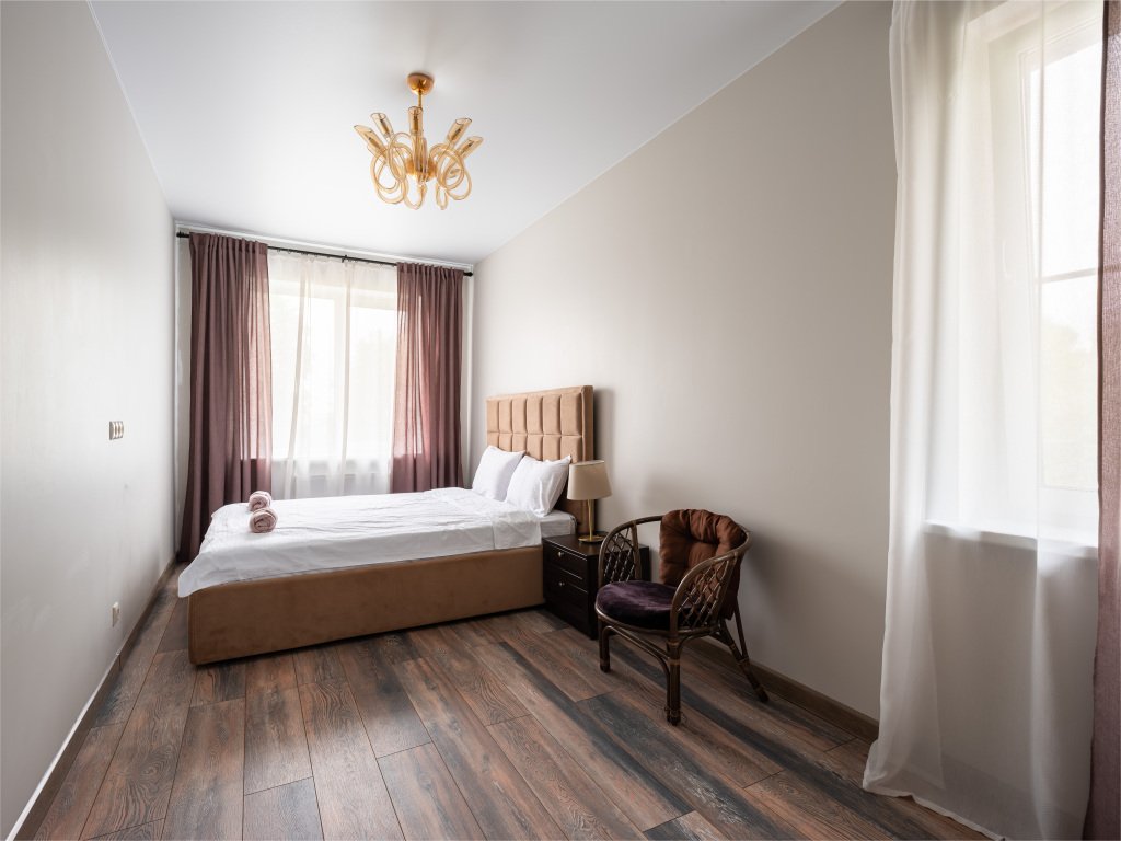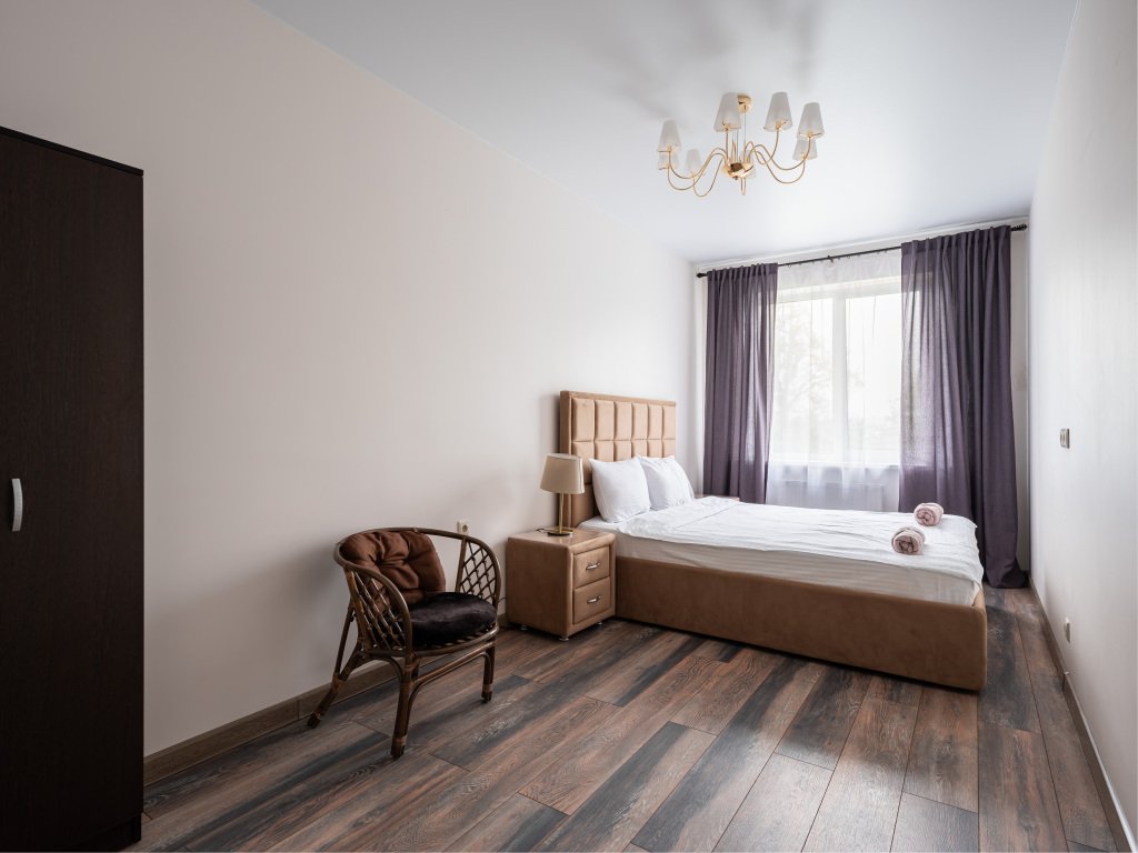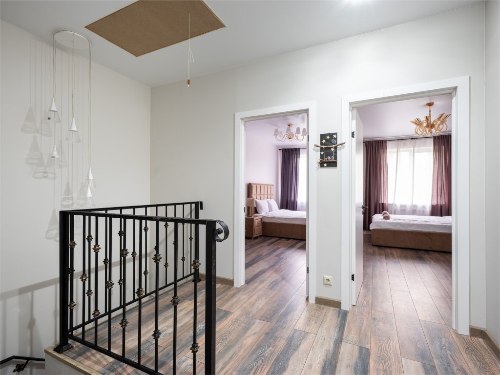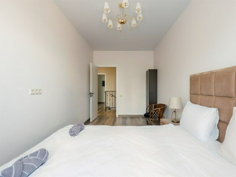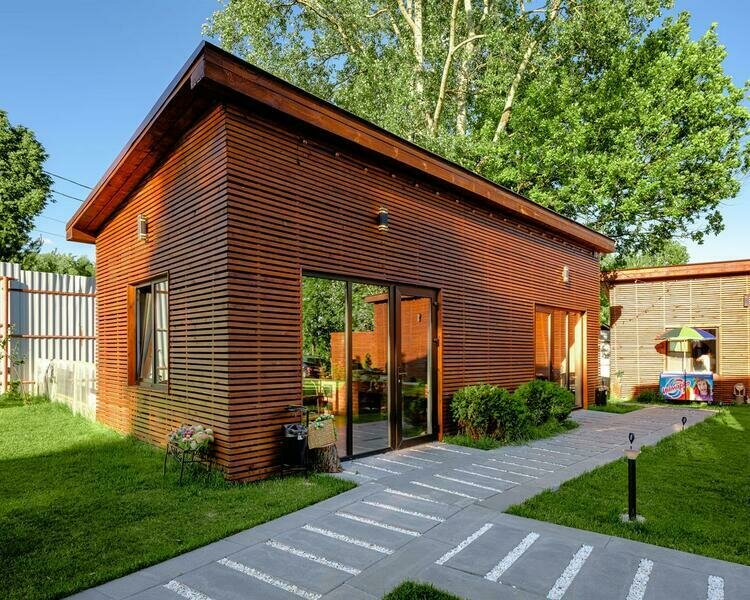 Полноценный двухэтажный дом для комфортного размещения от одного до четырех гостей. В коттедже — одна просторная спальня на втором этаже с кроватью размера king size и большой раскладной диван на первом этаже.