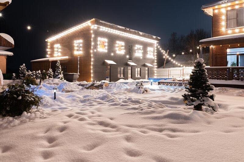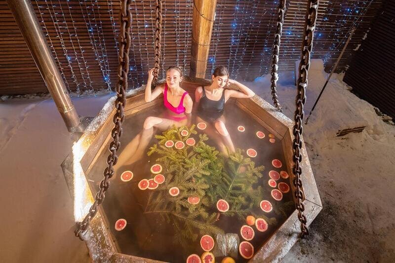 На территории также оборудован открытый плавательный бассейн, русская баня, сибирский дровяной чан и два круглогодичных отапливаемых барбеклю-комплекса с панорамным остеклением.