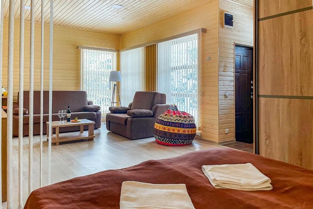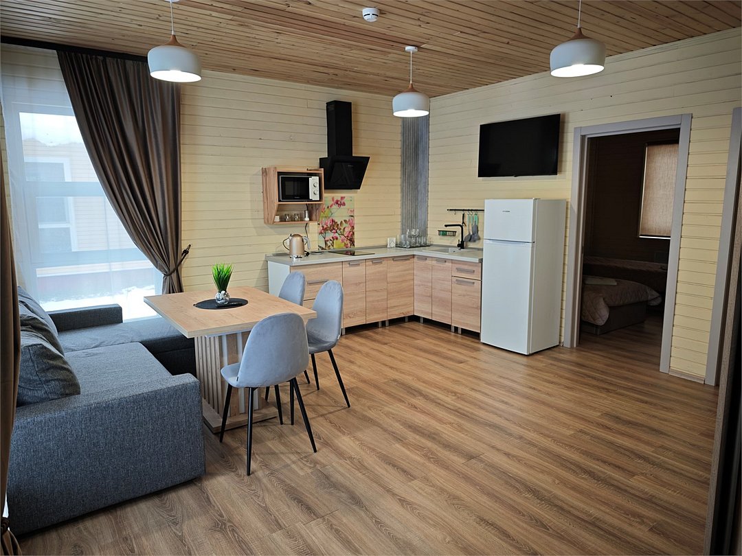 Аренда включает: Общая площадь домика: 48 кв метра; Количество комнат: 1; Санузел в доме: туалет, душ. Мебелировка: Двуспальная кровать; Двуспальный диван с выкатным механизмом трансформации; Кресло с выкатным механизмом трансформации; Функциональный шкаф-купе; Рабочий стол Другие опции: Телевизор с диагональю 32 дюйма; Кондиционер; Холодильник; Чайник; Фен; Бесплатный WI-FIУслуги и удобства