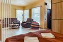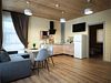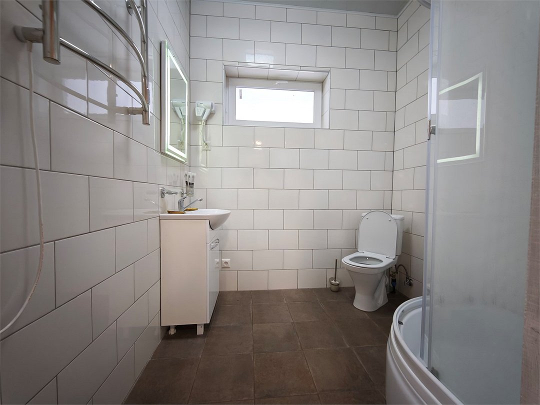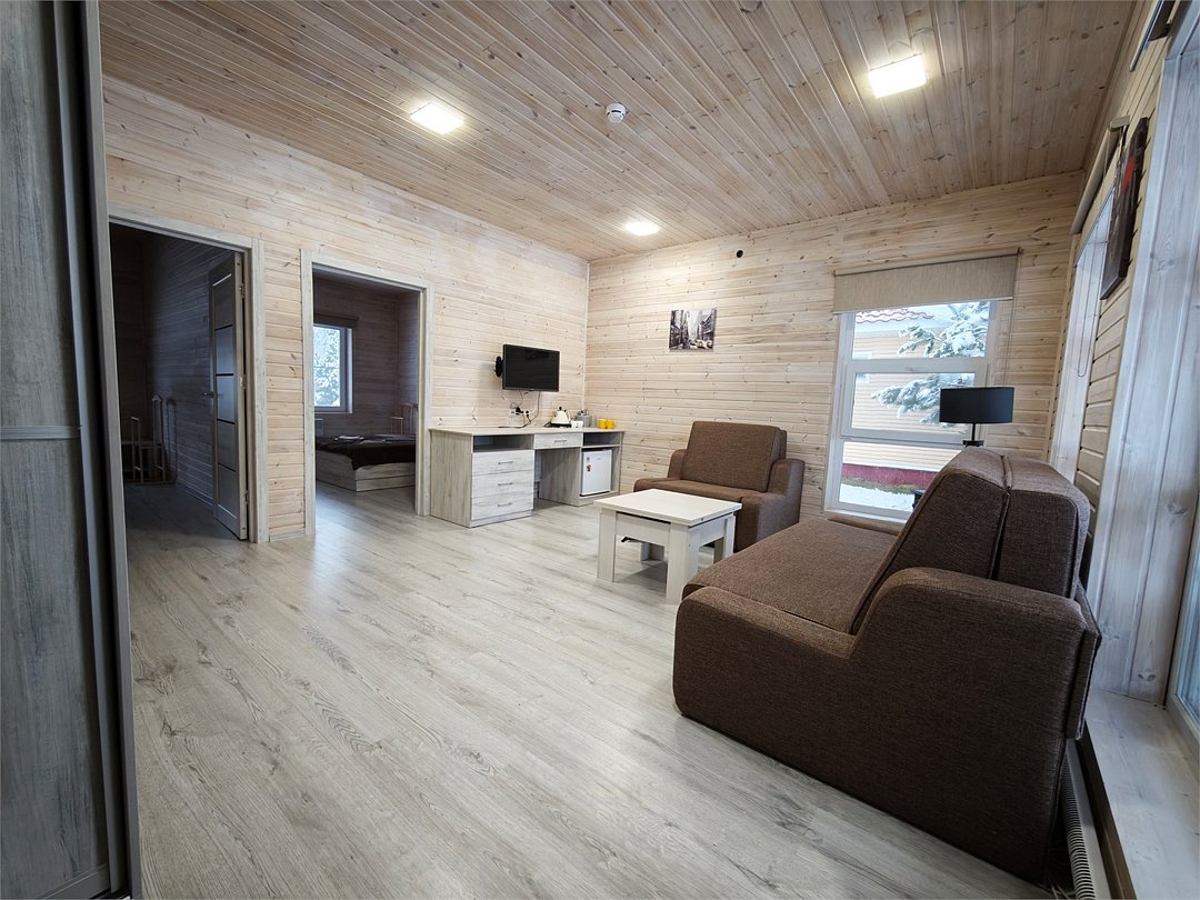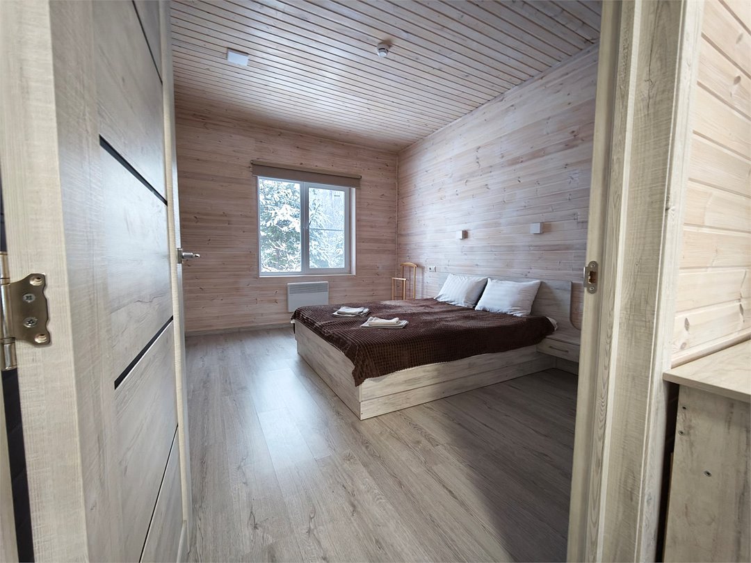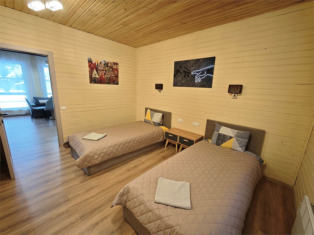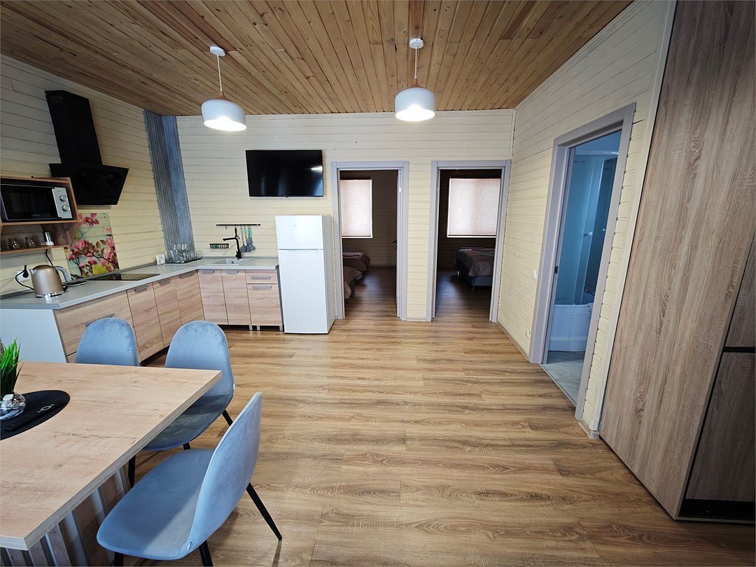 Дом 70 метров. 1 санузел с душем. 2 спальни - одна с двуспальной кроватью, вторая с двумя односпальными. В гостиной: Двуспальный диван с выкатным механизмом трансформации; Кресло с выкатным механизмом трансформации; Функциональный шкаф-купе; Рабочий стол Другие опции: Телевизор с диагональю 40 дюймов; Холодильник; Чайник; Фен; Бесплатный WI-FIУслуги и удобства