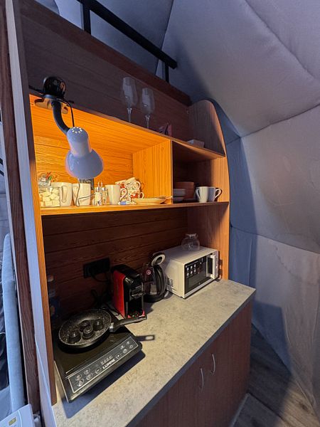 Есть микроволновка, есть чайник, кухня в доме оборудована, кухня в номере.