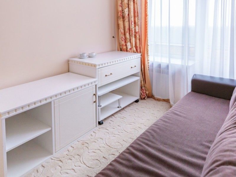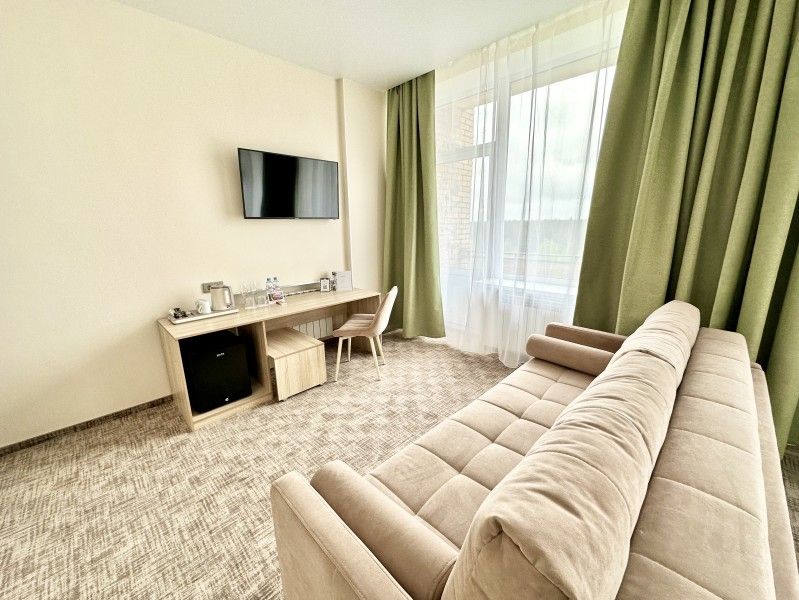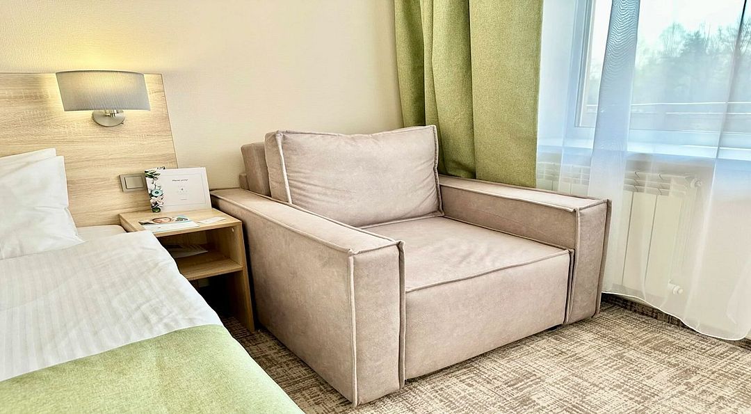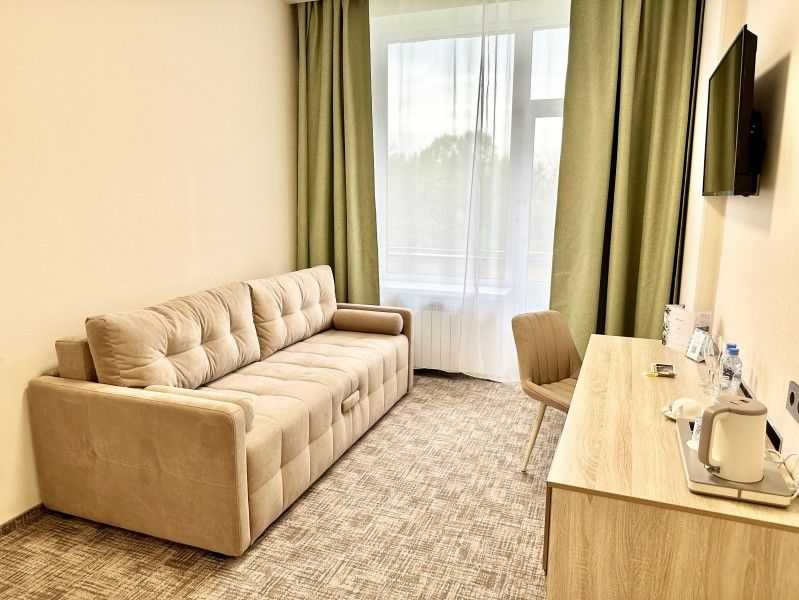 Просторный однокомнатный номер площадью 30 м2 с двуспальной или двумя односпальными кроватями и дополнительным спальным местом в виде раскладного дивана.