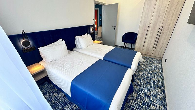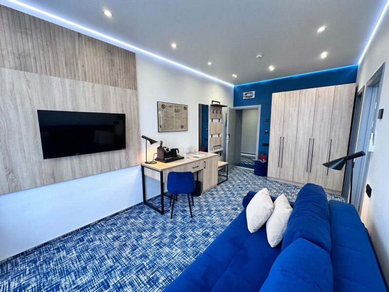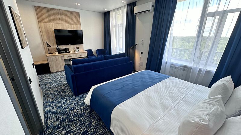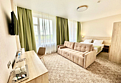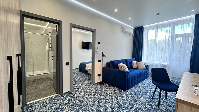 НОВЫЙ двухкомнатный номер площадью 30 м2 с изолированной спальней с двуспальной или двумя односпальными кроватями и гостиной с раскладным двуспальным диваном.