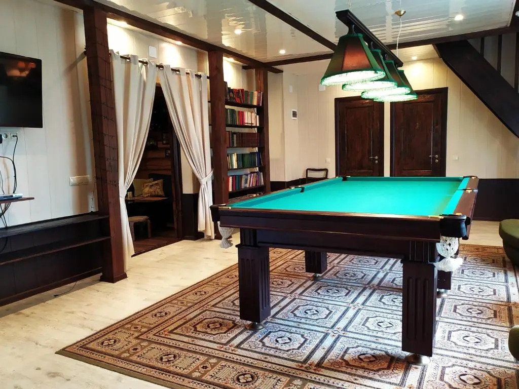 Первый этаж объединяет комфортабельную кухню, уютную гостиную комнату с камином и телевизором, а также отдельную бильярдную комнату с ещё одним телевизором. Оборудованная мангальная зона создаёт идеальное место для отдыха на свежем воздухе.