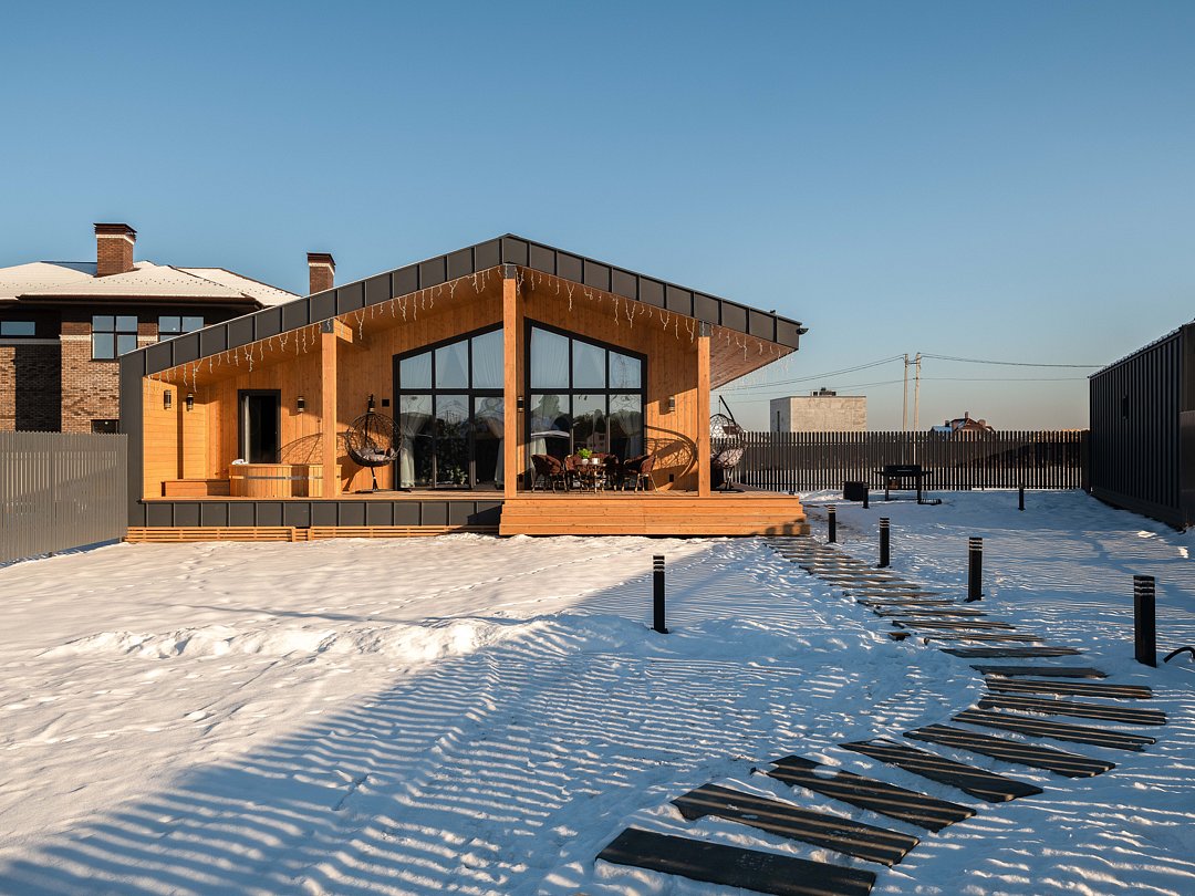 Современный дом с панорамными окнами и сауной.