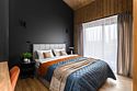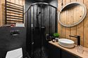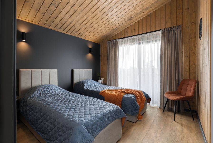 Дом состоит из двух комнат, кухни-гостиной и двух санузлов — мастер-спальни с двуспальной кроватью 160х200, спальни с кроватью трансформером, где предлагаются два варианта размещения: две односпальные кровати 80х200, либо сдвоенная кровать через дополнительный матрас топпер 160х200, кухни-гостиной с диваном-кроватью 140х200, два санузла с душевой кабиной и теплым полом.