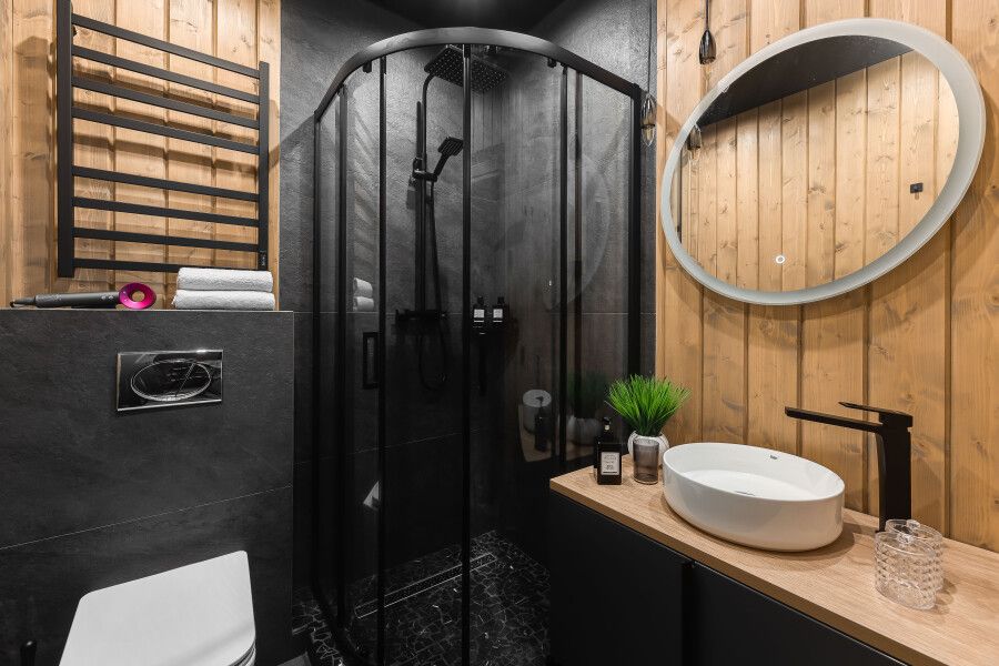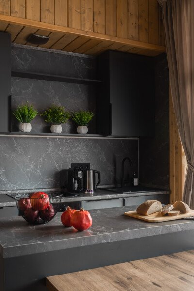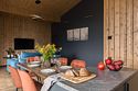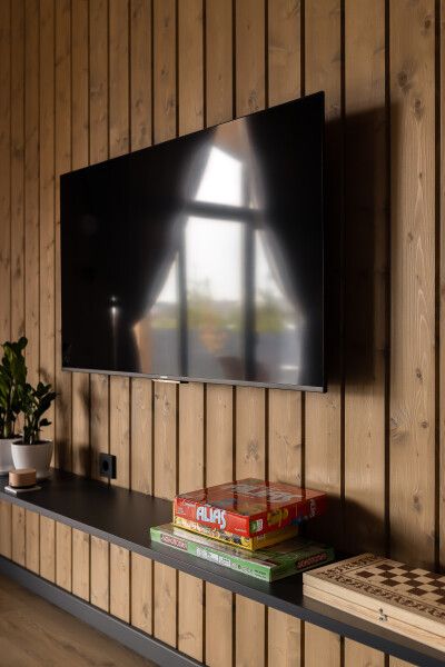 Дом оборудован всей необходимой мебелью и бытовой техникой — духовым шкафом, варочной панелью на четыре конфорки, большим холодильником с морозильной камерой, микроволновкой, посудомоечной машиной, современным телевизором со SMART TV, тремя большими шкафами и сушкой для горнолыжной одежды, кофемашиной для капсульного кофе, шампурами и решеткой для мангала, дровами, углем, спичками для растопки печи или мангала.