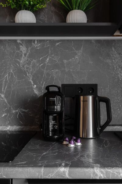 Дом оборудован всей необходимой посудой — тарелками, большим выбором бокалов, стаканами, чашками, всеми необходимыми столовыми приборами, включая штопор, различными кастрюлями, сковородками, дуршлагом и т. д., фольгой, пищевой пленкой, пергаментом, льдом, трубочками для коктейлей и т. д.
