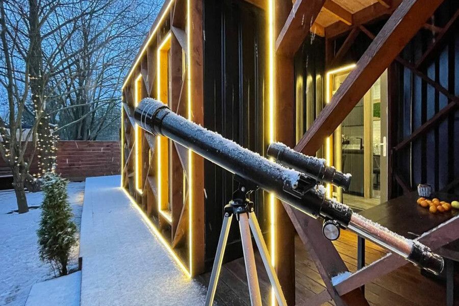 На ухоженной территории: деревья, лавочки для отдыха, подвесные коконы, мангальная зона и купель на дровах. Чтобы разнообразить досуг Вы можете воспользоваться велосипедом-тандемом или понаблюдать за звездами через телескоп.