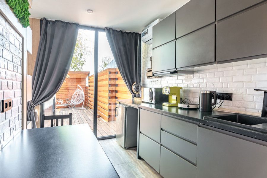 В домике полностью оборудована гостевая кухня (холодильник, микроволновка, плита, чайник, кофеварка и т.д).