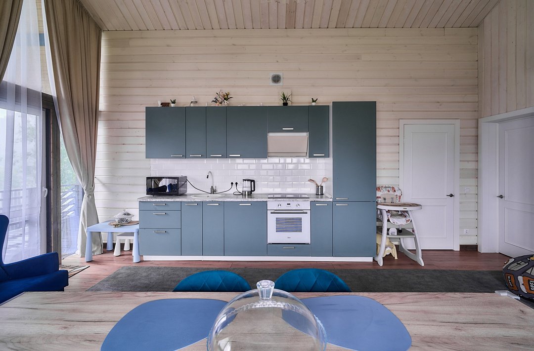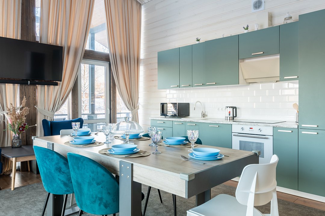 Просторная кухня-гостиная с диваном и камином оборудована всей необходимой техникой и посудой. Вам не придется ничего везти с собой. Есть посудомойка!
