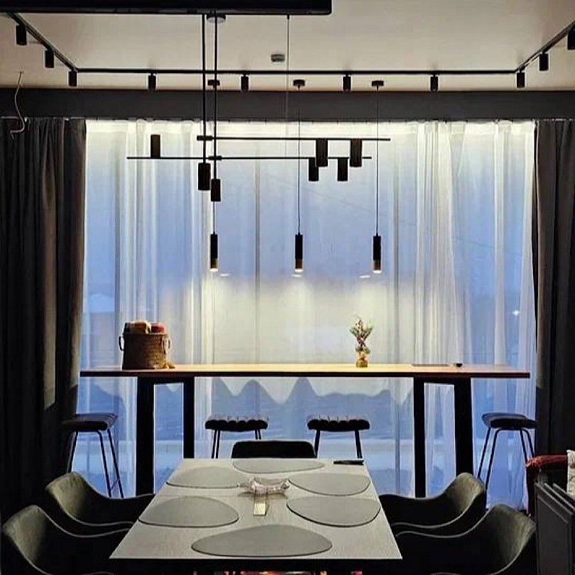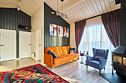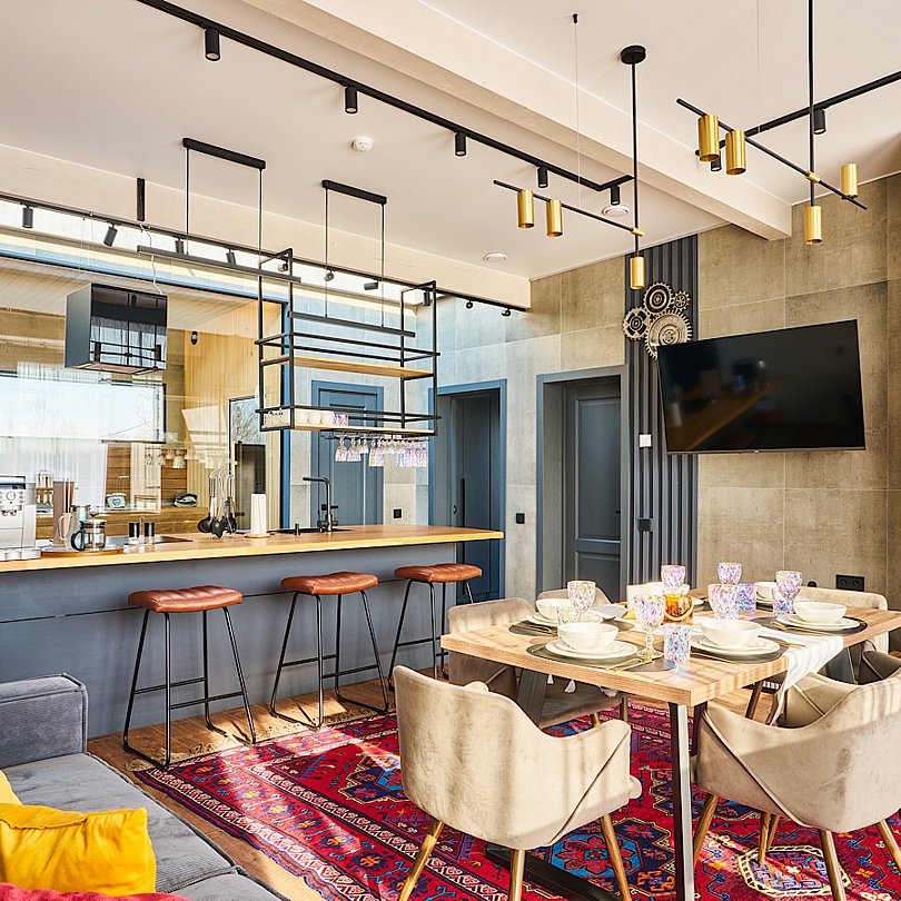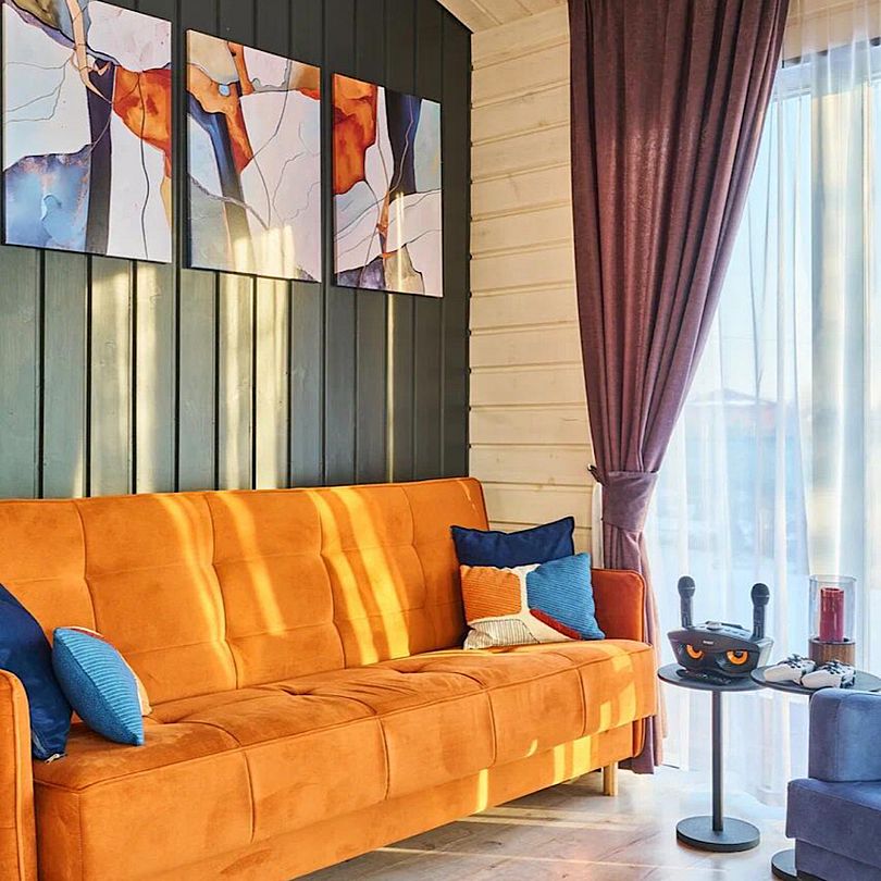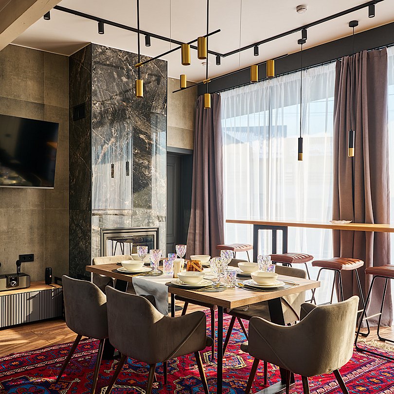 - просторная гостиная с камином, барной стойкой, раскладным диваном и современным Smart-TV;