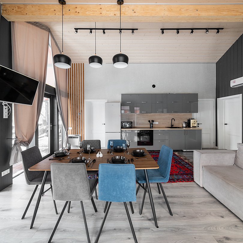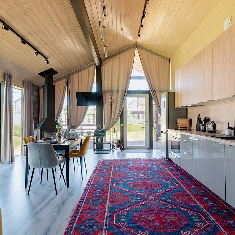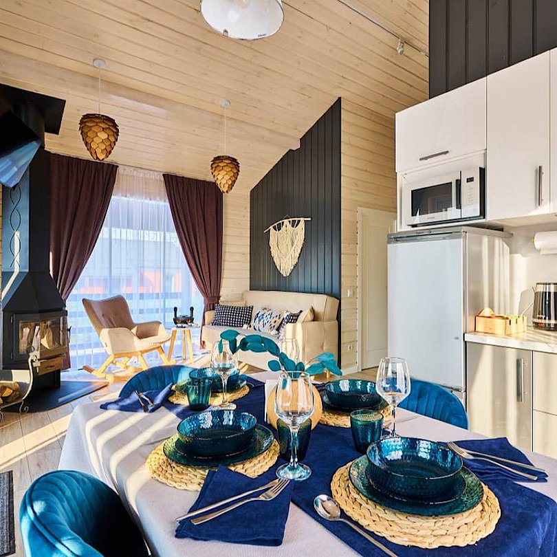 Просторная кухня-гостиная с диваном и камином оборудована всей необходимой техникой и посудой. Вам не придется ничего везти с собой.