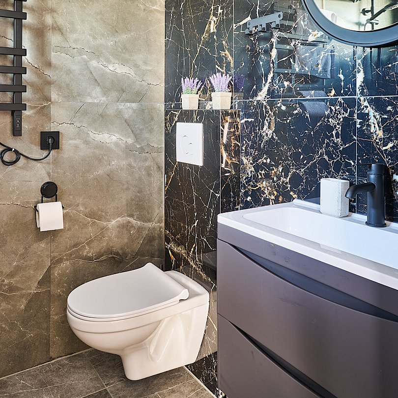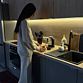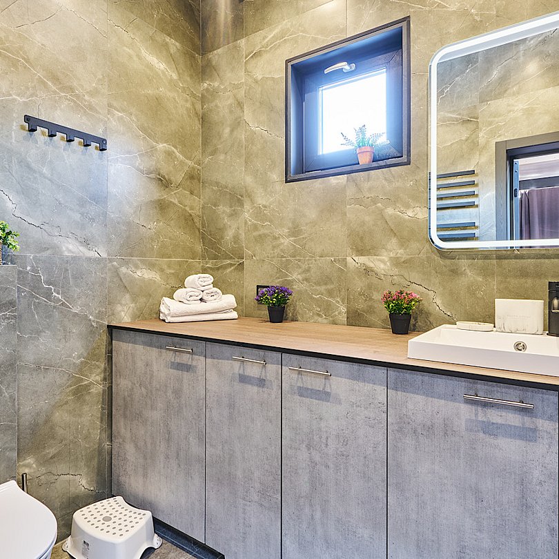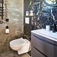 - санузел с теплым полом, душевой кабиной, унитазом, раковиной, феном и зеркалом с подсветкой;
