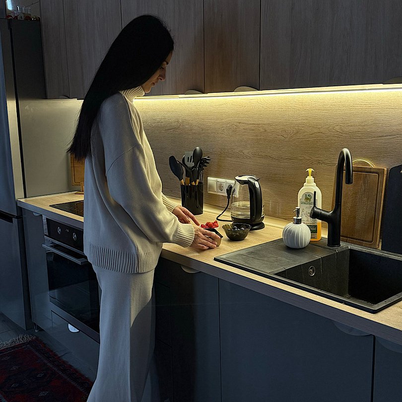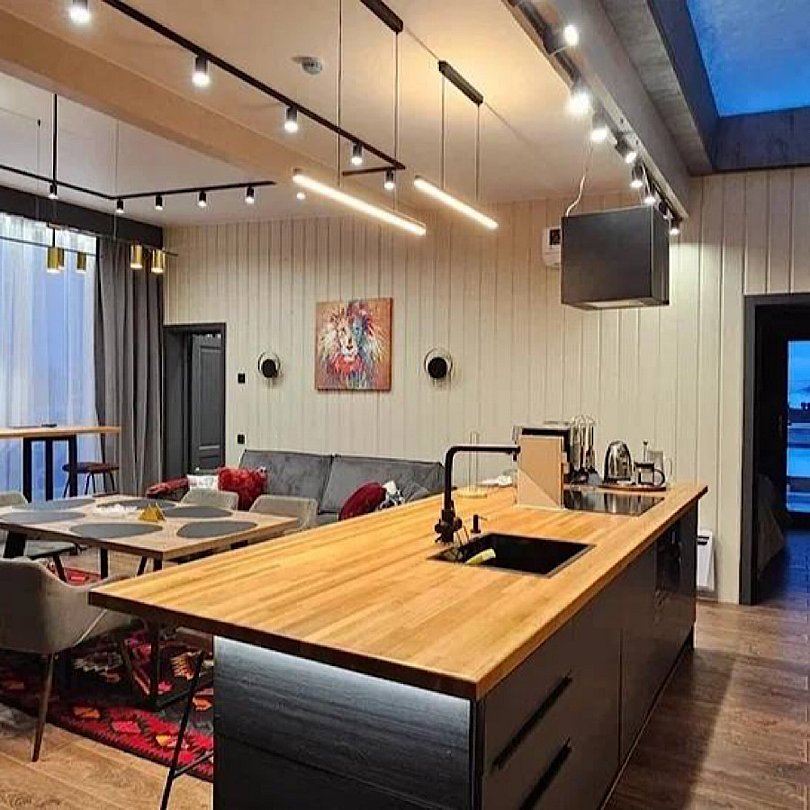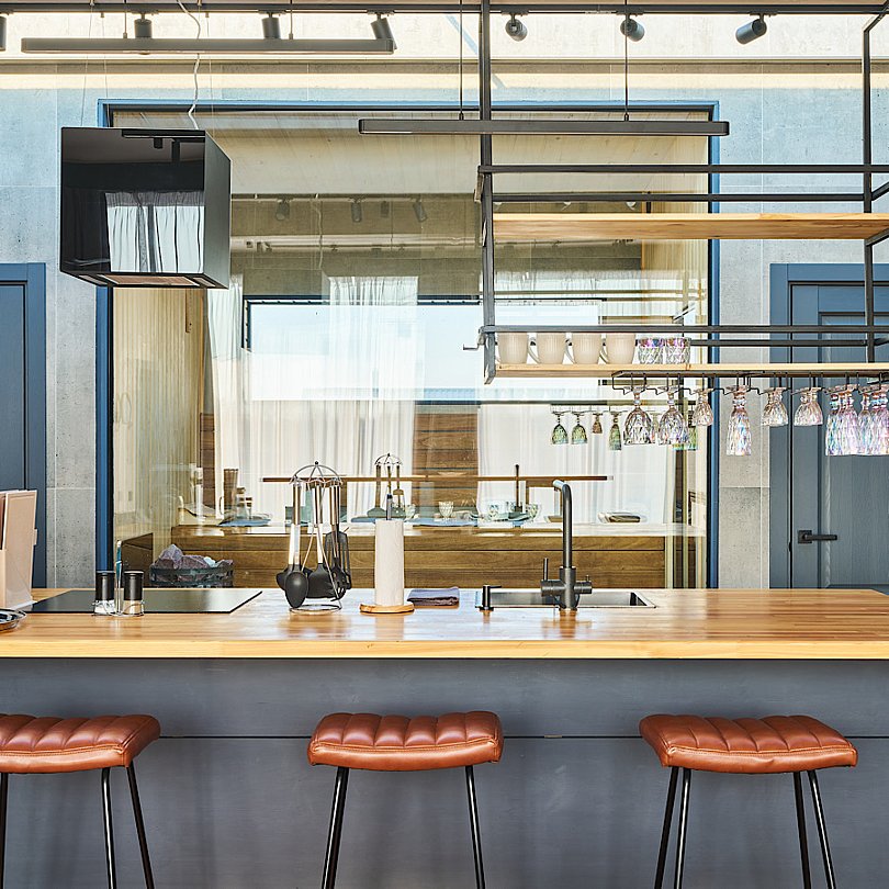 - кухонный островок со всей необходимой техникой, кофемашиной, посудой и столовыми принадлежностями;
