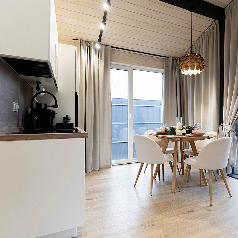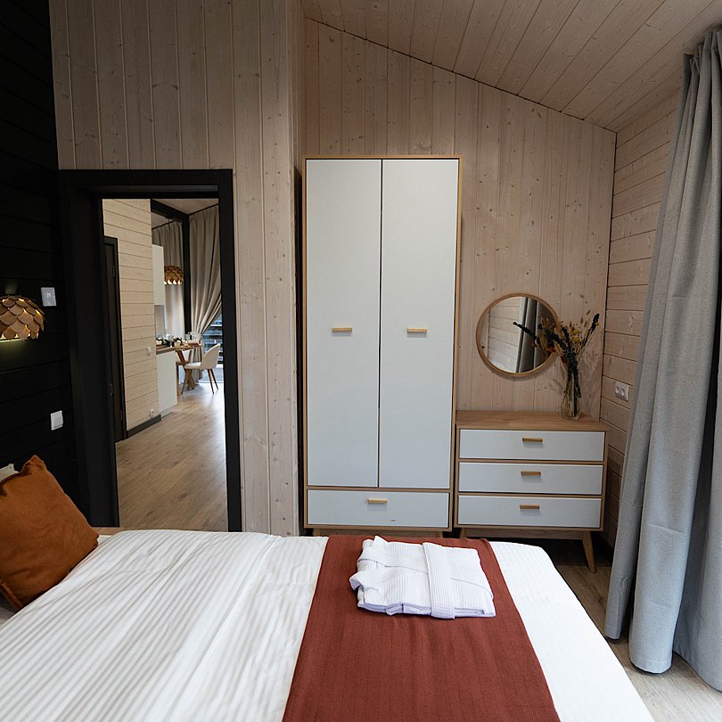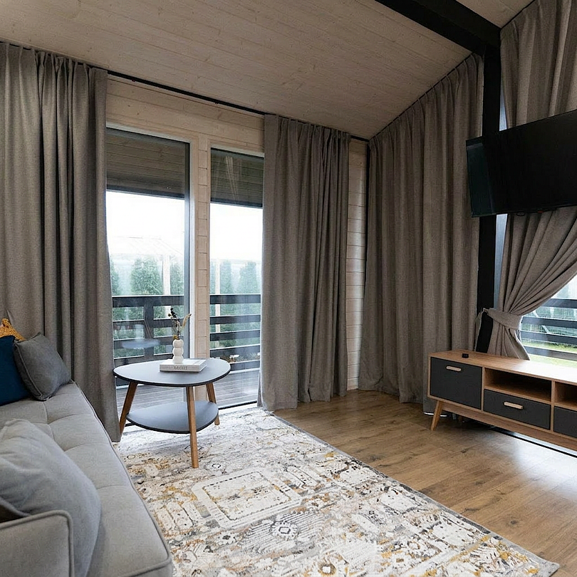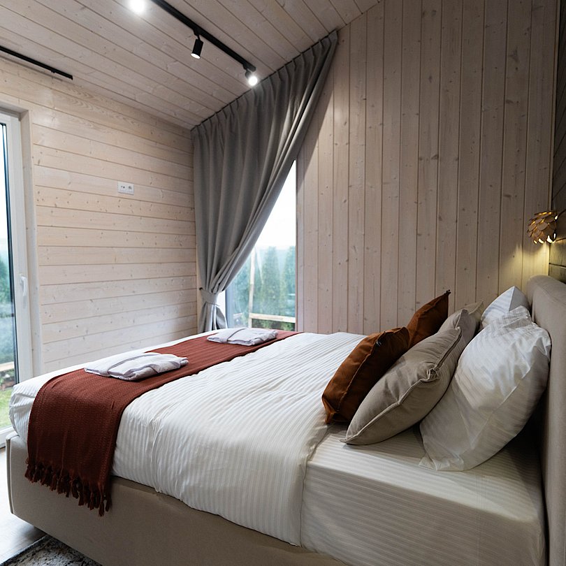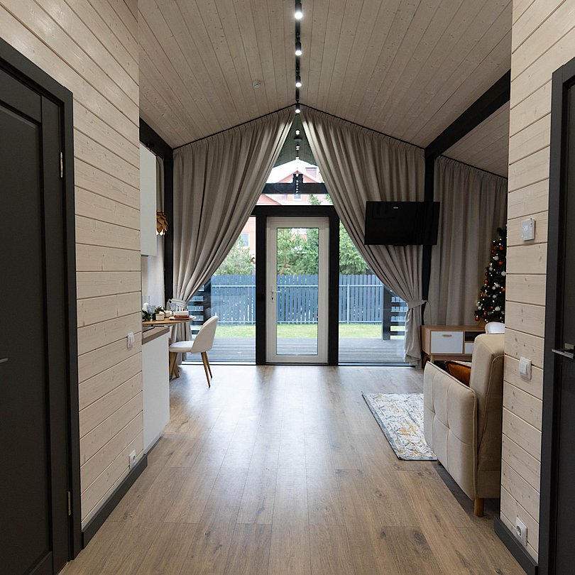 Новые дома с террасой и современным интерьером полностью оборудованы для комфортного проживания. В них есть 2 изолированные спальни; гостиная с раскладным диваном и Smart TV, кухня, оснащённая бытовой техникой и посудой, высокоскоростной Wi-Fi, санузел и стиральная машина, тёплые полы, умное отопление, кондиционер.