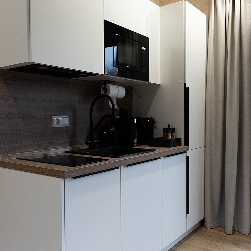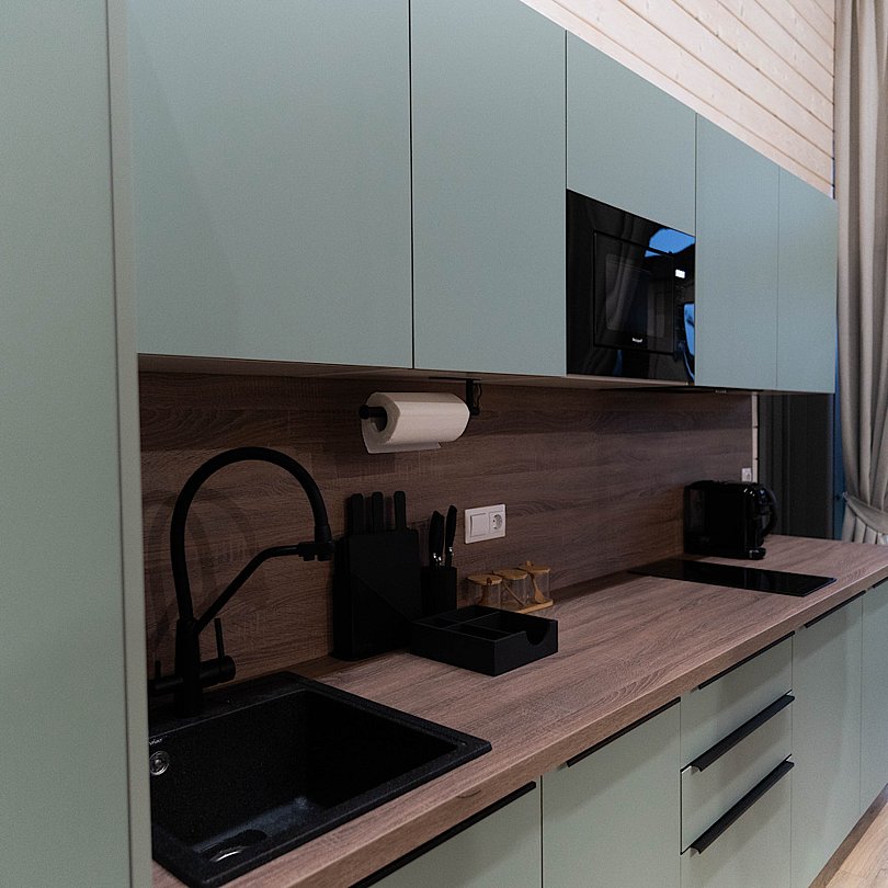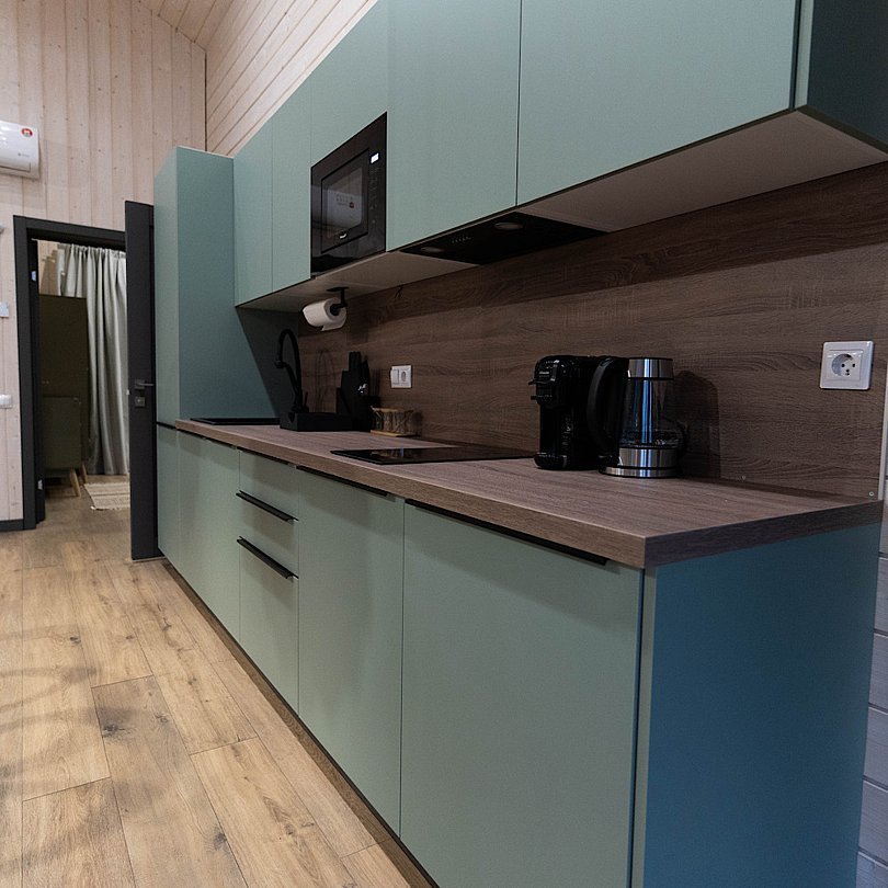 - полностью оснащённая кухня — техника, посуда и столовые приборы;