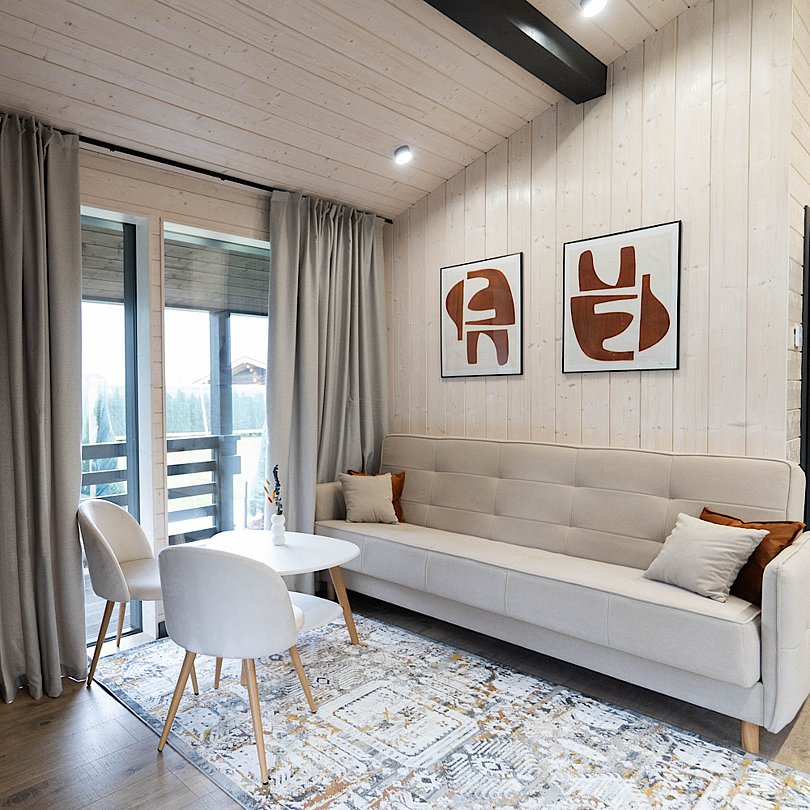 - просторная гостиная с раскладным диваном и современным Smart-TV;